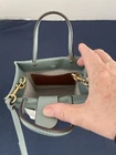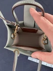 This is a Coach Mini Cashin Tote crafted from sage glovetanned leather. It features a rectangle shape with a magnetic closure and buckle accent. The bag has a mini size with a buttery soft finish and gold hardware. It can be carried as a tote or crossbody with a sage green leather handle/strap. The interior lining is fabric, and it includes a detachable strap, and bag charm. Ideal for various occasions, this classic designer piece combines style and functionality.