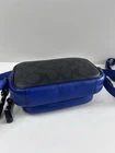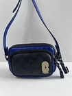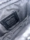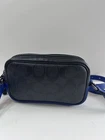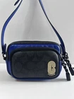 Signature coated canvas and smooth calf leather Zip closure, fabric lining Outside zip pocket Adjustable strap with 25" drop for shoulder or crossbody wear 6 1/4" (L) x 3 3/4" (H) x 2" (W) Style No. C1643 Like new condition