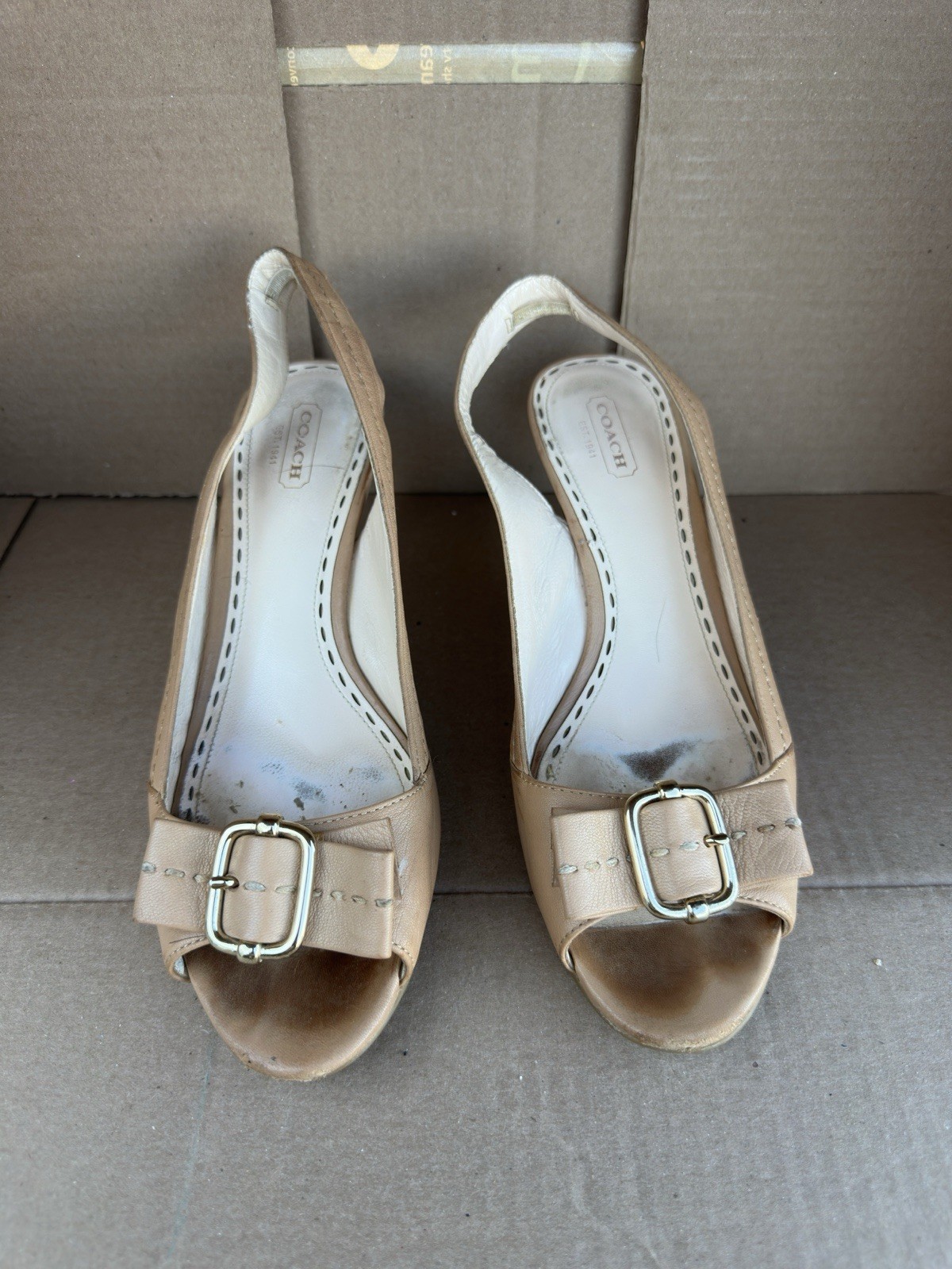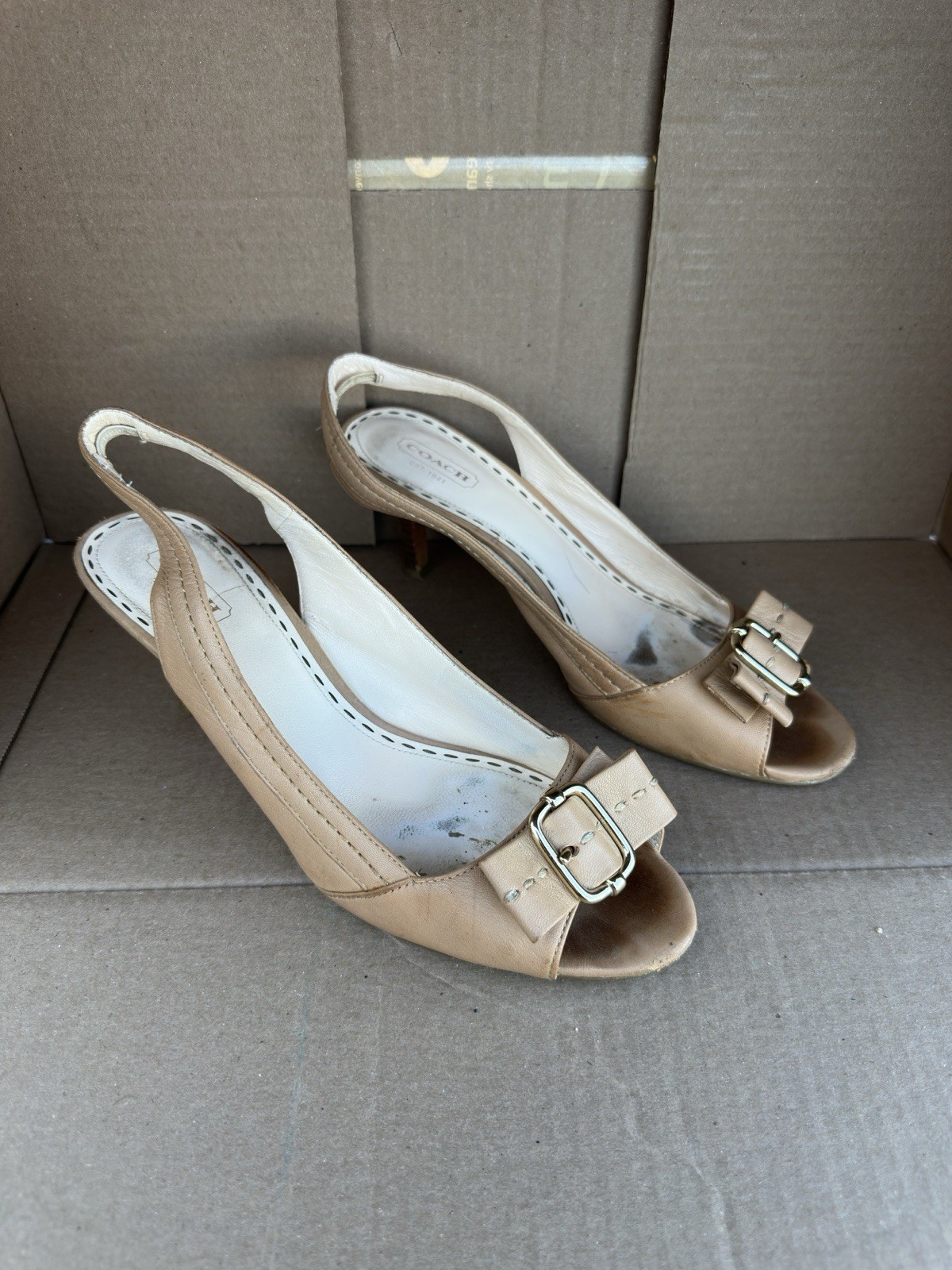 Classic Coach Miranda slingback heels in a versatile nude/tan leather. A timeless silhouette suitable for workwear, events, or everyday polished looks. Details: • Brand: Coach • Style: Miranda • Color: Nude / Tan • Size: US Women’s 8.5 AA (Narrow width) • Heel Style: Mid heel • Material: Leather upper • Made in China Condition: Pre-owned. Visible wear to the soles and heel tips. Interior footbeds show discoloration and wear consistent with prior use. Leather uppers remain intact with no structural issues. Please review all photos carefully for condition details. A classic Coach heel offered at a great value.