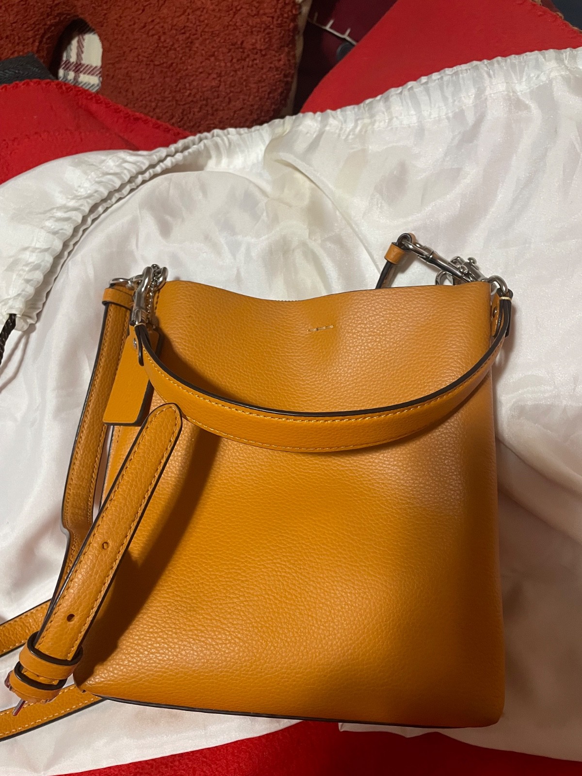 The Coach Mollie Bucket Women's Crossbody Bag in black is a stylish and practical choice for women on the go. Made from high-quality leather, this small square-shaped bag features a solid exterior with zipper, magnetic, drawstring, and snap closures. The black crossbody strap adds convenience and versatility, while the gold-plated hardware adds a touch of luxury. With inner pockets and a lightweight design, this bag is perfect for carrying essentials in style. Additionally, the bag comes with a detachable strap, brand card, maintenance card, and bag charm, making it a great accessory for any outfit.