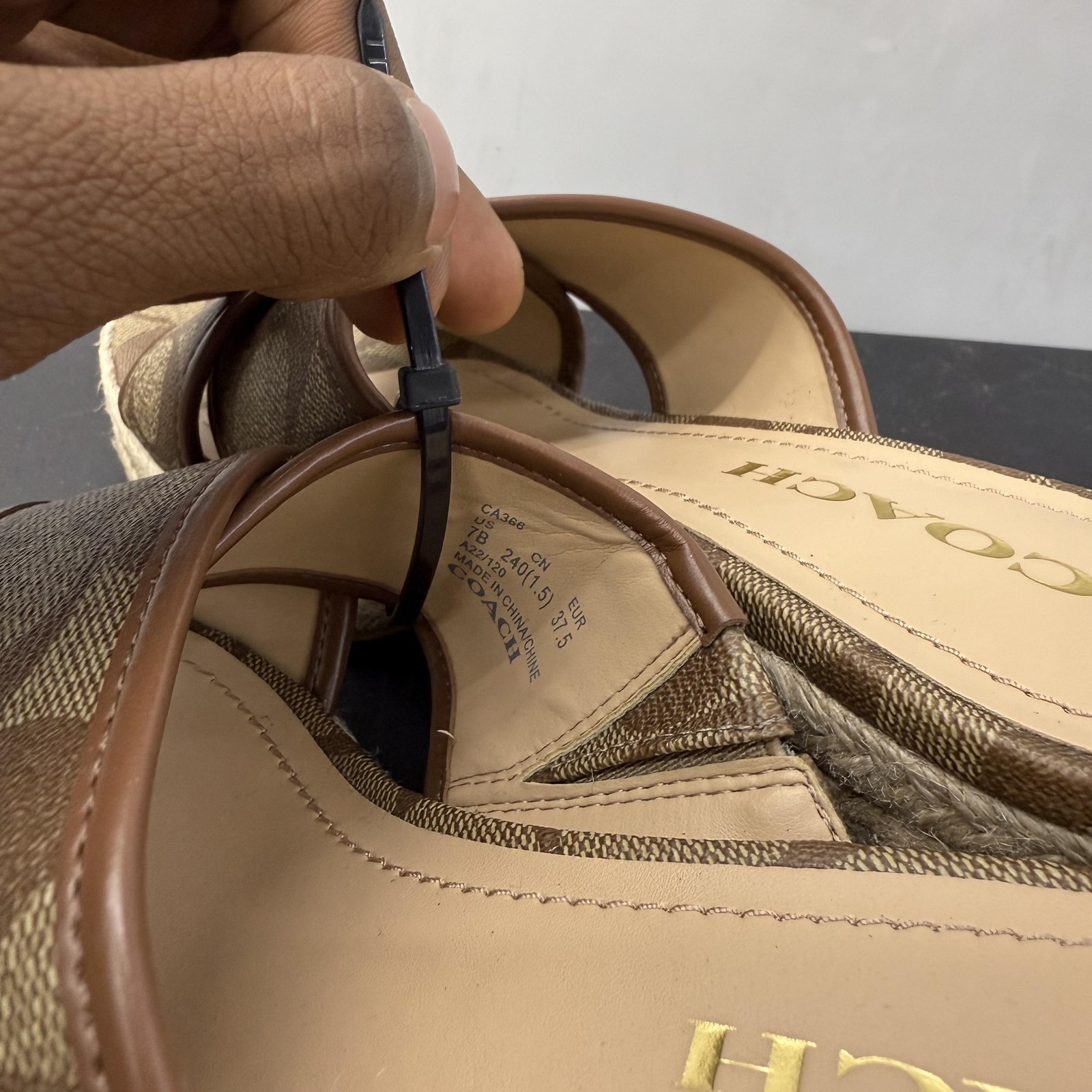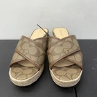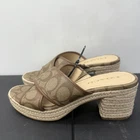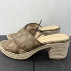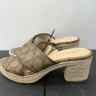 Coach Shoes Womens Size 7 Brown Monogram Canvas Block Heel Espadrille Sandals Condition: Gently worn, light wear visible on outsoles; upper and insoles show no significant flaws Signature brown Coach monogram canvas uppers with tan leather trim Slip-on mule design with open toe and double strap Espadrille-style rope-wrapped midsole and sturdy 2.5" block heel Coach gold logo insole branding and embossed logo underfoot Made in China Style code: A2172B Tag size: Womens 7 US / 37.5 EU / 240 (1.5) CN Perfect for summer, vacation, or casual occasions