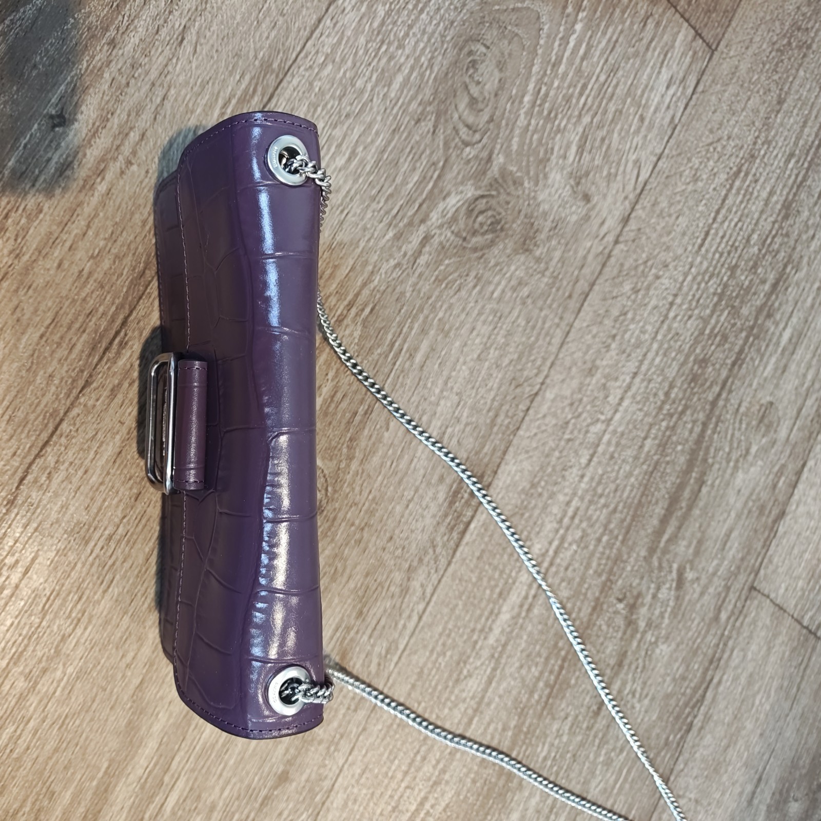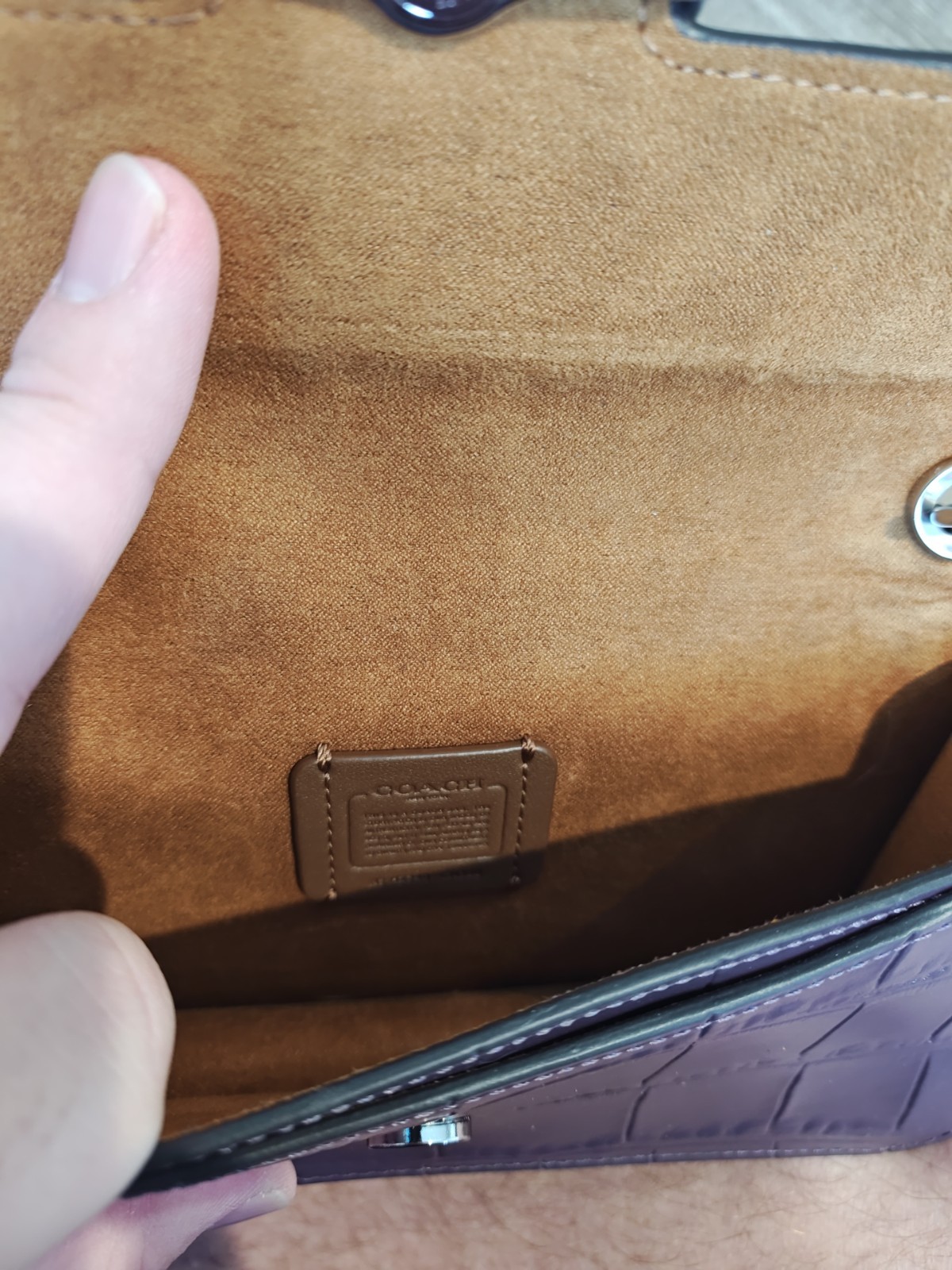The Coach Morgan Crossbody Amethyst Textured Leather is a stylish and compact handbag designed for women. Made from luxurious leather with a solid exterior color of purple-gray, this small crossbody features a snap closure and a silver metal handle/strap. The crocodile accents add a touch of sophistication to the overall design, making it a fashionable accessory for any outfit. The Coach brand ensures high quality and timeless style, making it a must-have for handbag enthusiasts.