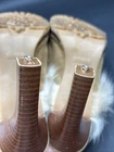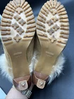 Please see photos the tip of the heels are missing. These can be replaced can be done at home or in a shop The Coach Mules Tan Kristy Heels in size 6.5B are a stylish and elegant pair of shoes perfect for the fashion-forward woman. These slip-on heels feature a block heel style with a high heel height of 3-3.9 inches, making them ideal for evening occasions or activewear. The almond toe shape and faux suede upper material in tan color with fur trim and lace-up accents add a touch of hipster, designer flair to the overall look. With a vintage feel and a hint of goddess elegance, these Coach mules are a versatile choice for the winter, fall, and spring seasons.