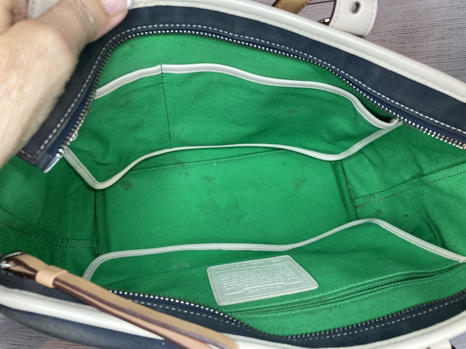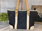 Coach Hampton Large Tote Shoulder Bag Brand: Coach Model: Hampton Large Tote Style: Shoulder Bag Condition: Pre-owned Purse Closure: Zipper Exterior Color: Navy / White / Brown Exterior Material: Canvas Approximate Measurements (inches): 12L x 10W There are some signs of fading. The interior has some spotting. Price reflects this. Structure, leather and canvas are in great shape.