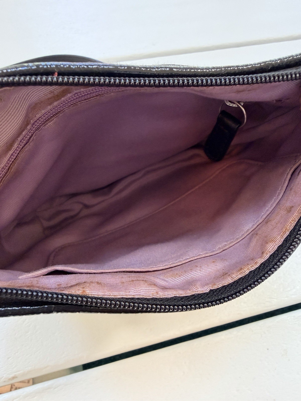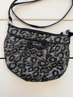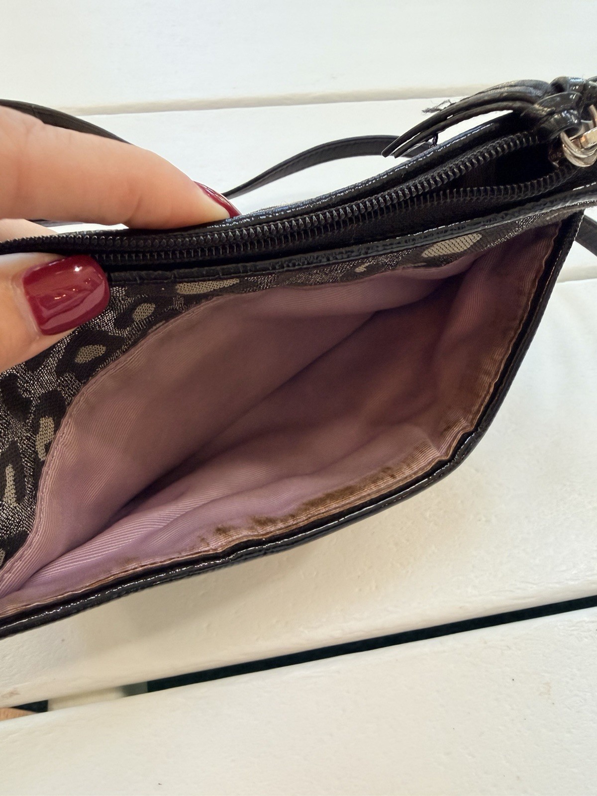 The Coach Ocelot Leopard Black & Silver Metallic Crossbody Shoulder Bag is a stylish and versatile accessory for women. Made from Coach metallic fabric and patent leather, this small bag features a striking leopard pattern with silver hardware accents. The black crossbody strap adds a trendy touch to the overall look, making it perfect for various occasions such as travel, weddings, parties, casual outings, and workwear. The bag's exterior color is silver, while the lining is a rich purple fabric, adding a touch of luxury to the design. This crossbody bag by Coach is a fashionable choice for those looking to make a statement with their accessories.