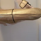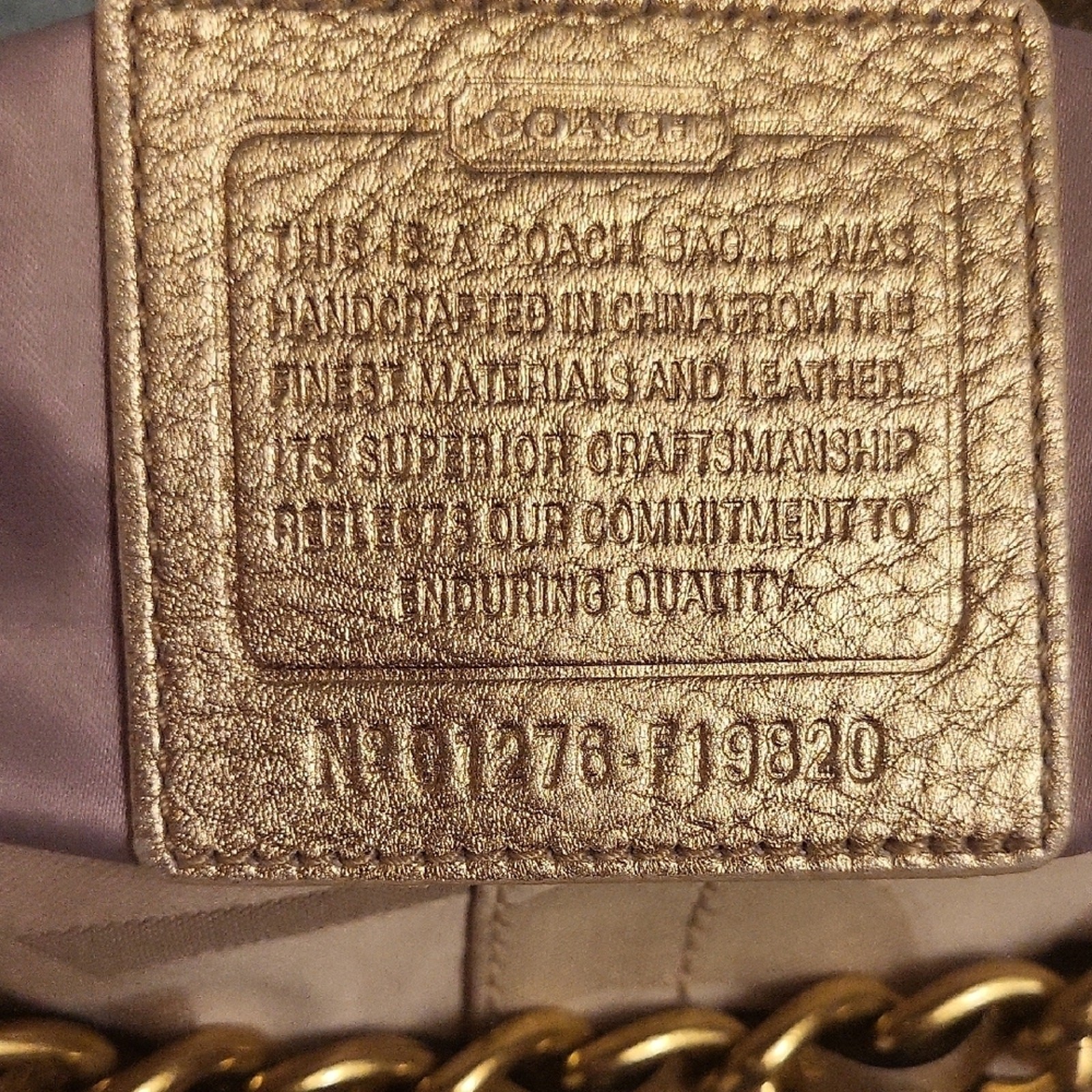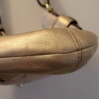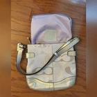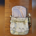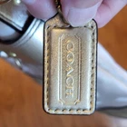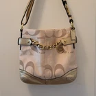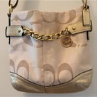 Chic Coach shoulder bag in tan and gold. She has gold hardware! Features elegant chain detail and signature design. Approximate dimensions 11" W x 10.5" H x 1.5" D Shoulder drop 10" Excellent pre-owned vintage condition purse! Add her to your wardrobe today!