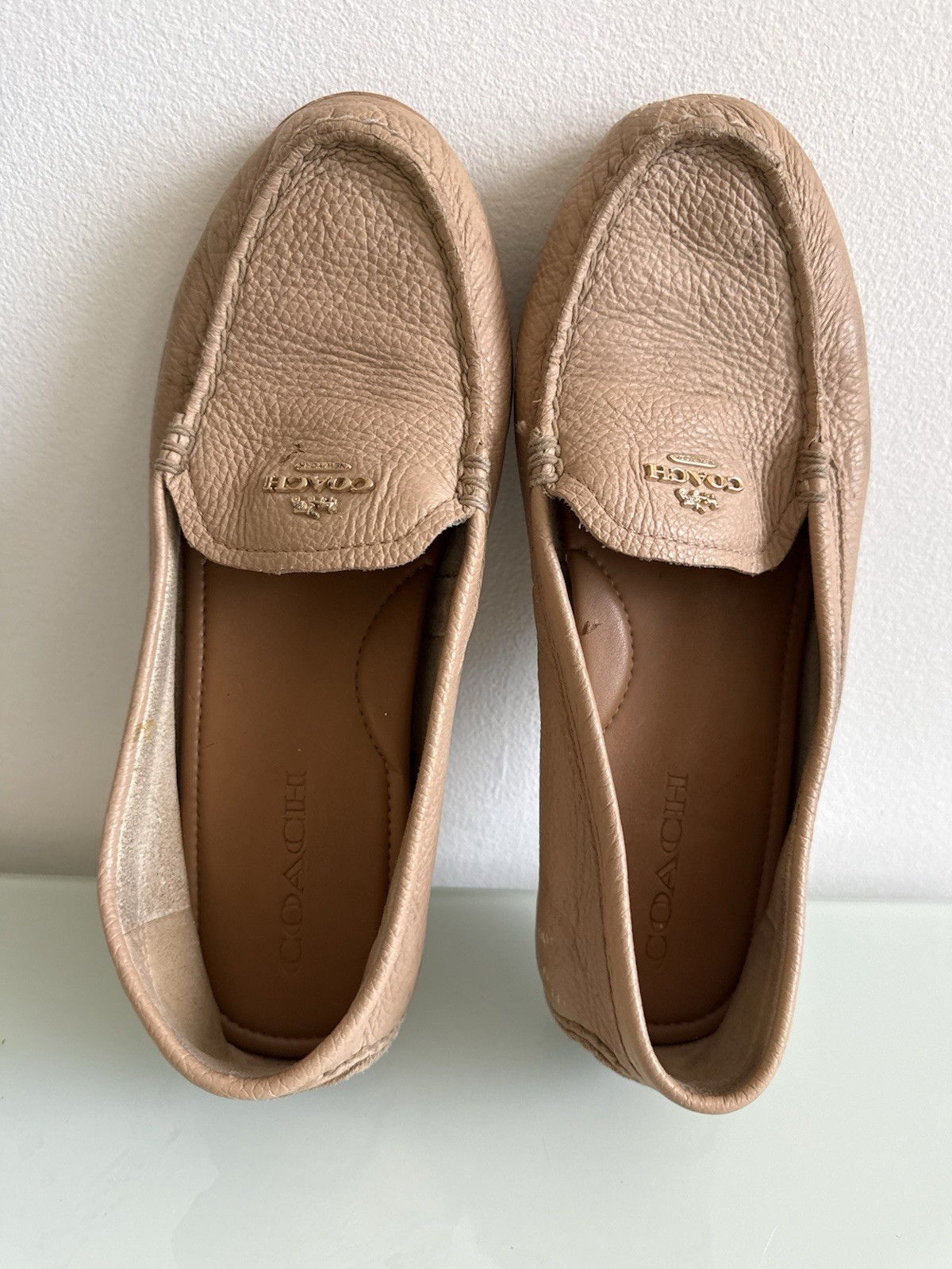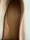 These Coach pebbled leather loafers in nude pink are perfect for women looking for a stylish driving moccasin. The size 7.5 flats feature a comfortable moccasin style with a pebbled leather upper, making them both fashionable and practical for everyday wear. The pink color adds a touch of femininity to the design, while the Coach branding ensures quality and style. Ideal for those seeking a versatile shoe option that can be dressed up or down.