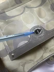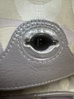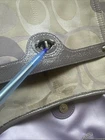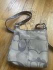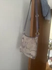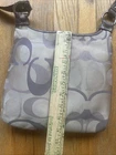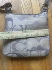 The Coach Penelope F17479 Signature Optic Crossbody Bag in purple/brown is a stylish and versatile medium-sized handbag. Made with a combination of canvas leather, this bag features the signature pattern in beige and purple, with hardware in matching purple color. The bag has a magnetic snap closure and a 20" adjustable strap drop for added convenience. This crossbody style bag is perfect for everyday use, adding a pop of color to any outfit with its vibrant purple accents.