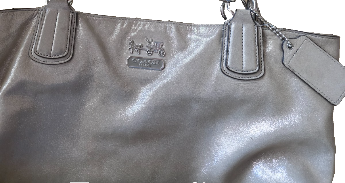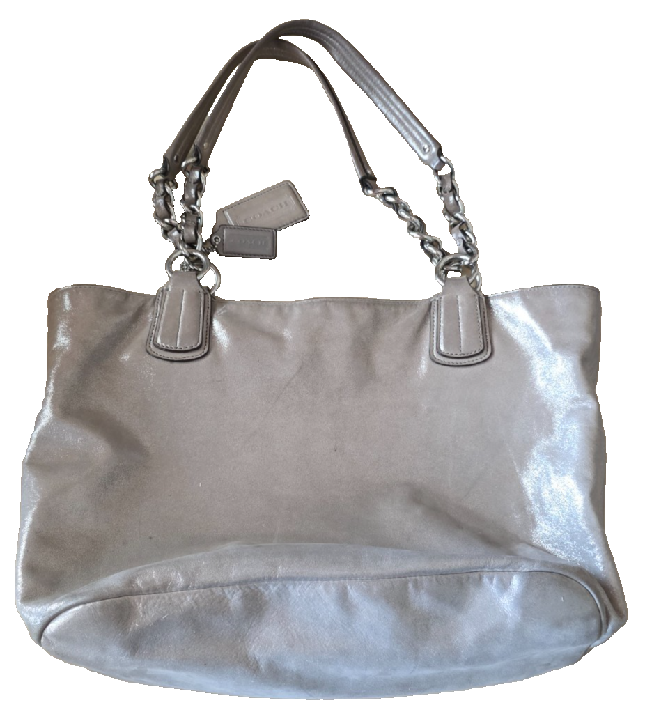 Coach metallic leather tote is perfect for everyday use or adding shine to your look. Made from soft pewter silver leather with dual leather and chain handles, this bag combines durability and glam with classic Coach craftsmanship. Features: Authentic Coach (Style No. 19422) Metallic leather in pewter/silver finish Dual chain and leather shoulder straps Coach logo embossed on front Includes Coach hang tag Spacious interior with zip and slip pockets Snap top closure Fabric lining - light purple - clean Condition: Decent pre-owned condition. Light surface wear and signs of use on the bottom and corners (see photos), and a few pen marks, but no major damage. The interior is clean, and all hardware functions properly. Approx. Measurements: 13” wide at the bottom 10” deep 9” purse drop A stylish and practical choice from Coach—perfect for work, errands, or casual outings. Ships fast and with care. Questions welcome!