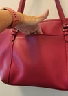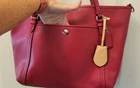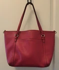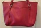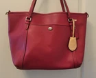 Beautiful pre-owned, red Coach Peyton Leather Pocket Tote Bag Dimensions: 12.5 W x 11 H x 5 D Genuine pebbled leather exterior in rich red Zip-top closure keeps your essentials secure Front slip pocket for easy access to keys or phone Interior zip pocket and multifunction slip pockets for organization Coach signature fabric lining Dual shoulder handles with approx. 8¼" drop Silver-tone hardware with Coach hangtag Pre-owned excellent condition. Minor corner rubs (see pics). Handles are in great condition. She has been well cared for. She is a beautiful red color, vibrant and ready for her next home! Let it be yours!