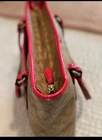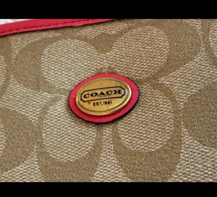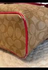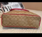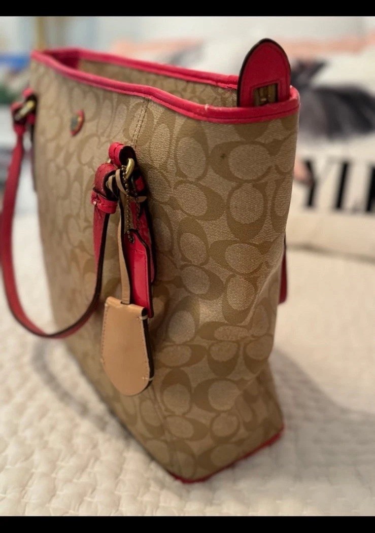 The Coach Peyton Signature Coated Canvas & Pink Patent Leather Tote #F27348 is a stylish and versatile handbag designed for travel, casual outings, and business meetings. This square-shaped tote features a zip closure, double pink patent leather handles, and gold hardware accents. The exterior is a combination of leather and PVC materials in pink, brown, and tan colors, with a beige lining. With its practical size and Coach signature logo pattern, this tote is a fashionable and functional choice for any woman on the go.