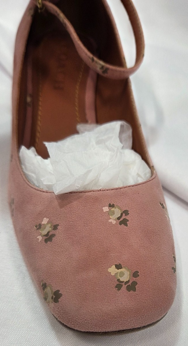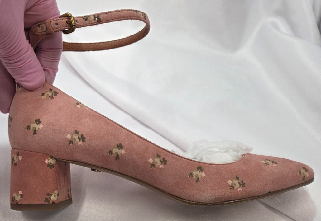 Coach Pink 45MM Suede Prairie Print Ankle Strap Heels Size 7.5B Brand: Coach Overall Condition: Excellent condition, minimal wear on soles upper are pristine. See pictures for details. Materials: Suede, leather, rubber, man made materials. Shipped with USPS Priority, Flat Rate or, when possible, First Class Mail. Description: The Coach 45mm Ankle Strap Pump with Prairie Print in pink is a 1960s-inspired shoe with a comfortable block heel. The general description is as follows: Style: Ankle strap pump with a square or squared toe. Color/Print: Pink suede with a multi-color prairie floral print. Material: Upper: Suede. Lining and Footbed: Leather. Outsole: Leather. Heel: Block heel, measuring approximately 1 3/4 inches to 2 inches (45 mm) high. Closure: Halo ankle strap with a buckle closure. Details for Shopper Size: 7.5 Shoes Width: B Heel Height: 2 inches Heel Type: Block Toe Style: Closed Square Toe Payment Policies We accept payment through PayPal, credit card, and debit card. Please note that the item may be relisted if payment is not received within the 10 day period. Shipping Policies Delivery estimates will be displayed at checkout. In-store pickup is also available if you would like to visit us in store. We ship to Continental United States only. Terms of Sale Each item we sell is unique. There are no exchanges for the same item available. All items are carefully inspected by My Sister’s Closet of Monroe County’s quality control team prior to shipping. Please carefully review item details. If you have questions, please message us regarding the item before purchasing. Note: Due to the different monitor and light effects, the actual color of the item shown might be slightly different from the color in pictures. Return Policy We strive to describe and measure our items accurately. If your order is not what you expected, we accept returns under the following conditions: The item was not as described as listed The wrong item was shipped. The item does not fit. If the wrong item was shipped, we will attempt to replace it with the item originally ordered. Please note - items not returned in the exact same condition, with tags attached, may be subject to a partial refund to account for loss of the item’s value. Please refer to eBay Return policy for more details. You are covered by the eBay Money Back Guarantee if you receive an item that is not described as listed. Return Requirements: The buyer must return the item within 30 days of receipt. Buyer is responsible for return shipping charges. The item(s) must be returned in the original condition, unworn, with tags attached. Thank you for shopping with us! A little bit more about us… My Sister’s Closet is a nonprofit serving women in poverty since 1998. Our mission is to help women move closer to economic self-sufficiency by providing essential career development tools. This includes job training, mentoring, advocacy services, and professional attire for job interviews to help them find employment. We have helped over 2500 women thus far. Most clients we serve have been dealing with homelessness, domestic violence, illness, divorce, job loss, economic recovery and/or lack basic education. Visit Our eBay Store