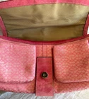 This Coach Women's Pink Signature Canvas Flap & Snap Soho Shoulder Bag Handbag Wallet is the perfect accessory for any casual or workwear outfit. With a medium size and a solid pattern, this bag is made of leather and canvas exterior material in a beautiful pink and baby pink and brown color combination. The flap and snap closure ensures the security of your belongings while the 8-inch handle drop provides a comfortable shoulder bag carrying experience. The vintage model F10926 has a brown lining color and is designed for women. It is a stylish and functional shoulder bag with a variety of compartments to store your essentials. This bag is perfect for any occasion and is sure to elevate your outfit.
