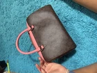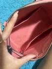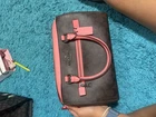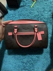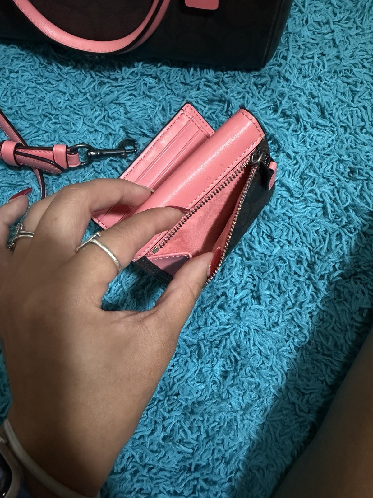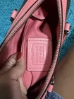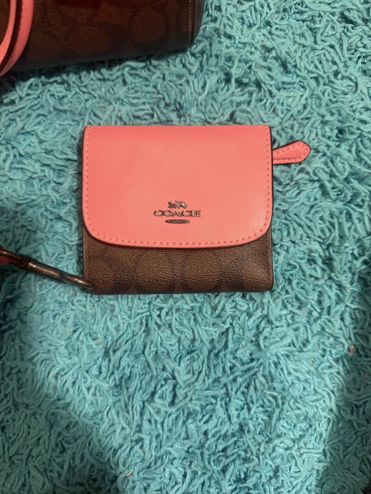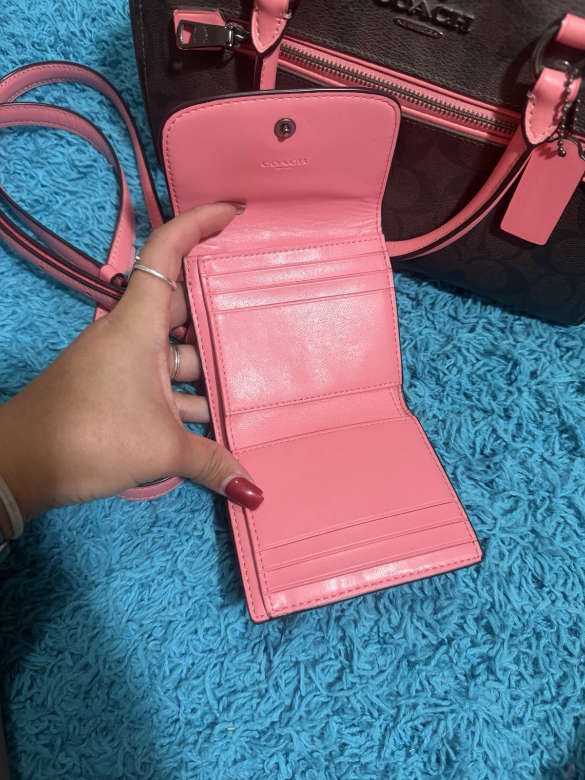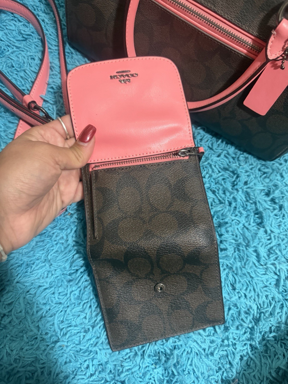 The Coach Pink and Brown Tote Hand Bag is a stylish satchel/top handle bag made of leather with a rectangle shape and a medium size. It features a pink zip closure and matching pink hardware accents, along with inner pockets for organization. The bag is adorned with the iconic Coach CC pattern and a pink bag charm, making it a fashionable designer accessory for women. The double pink leather handles add a touch of sophistication to this elegant handbag. Also comes with matching sophisticated bifold wallet and coin pouch.