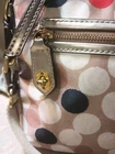 Embrace the harmony of style and function with the Coach Watercolor Print Polka Dot Sateen Crossbody Purse. A striking multicolored pattern adorns the exterior, making it a vibrant accessory to complement any outfit. The purse features a practical zip closure and a tan cotton strap that ensures comfort and durability for everyday use. Inside, the purse is lined with a multicolored cotton material, offering a cozy home for your essentials. The small size is ideal for carrying your essentials without the bulk. Additionally, the purse boasts anti-theft features and a charming bag charm for added flair. Gold hardware accents the design, adding a touch of elegance to this stylish crossbody.