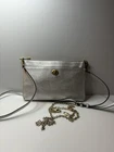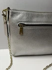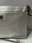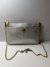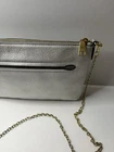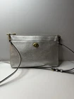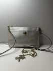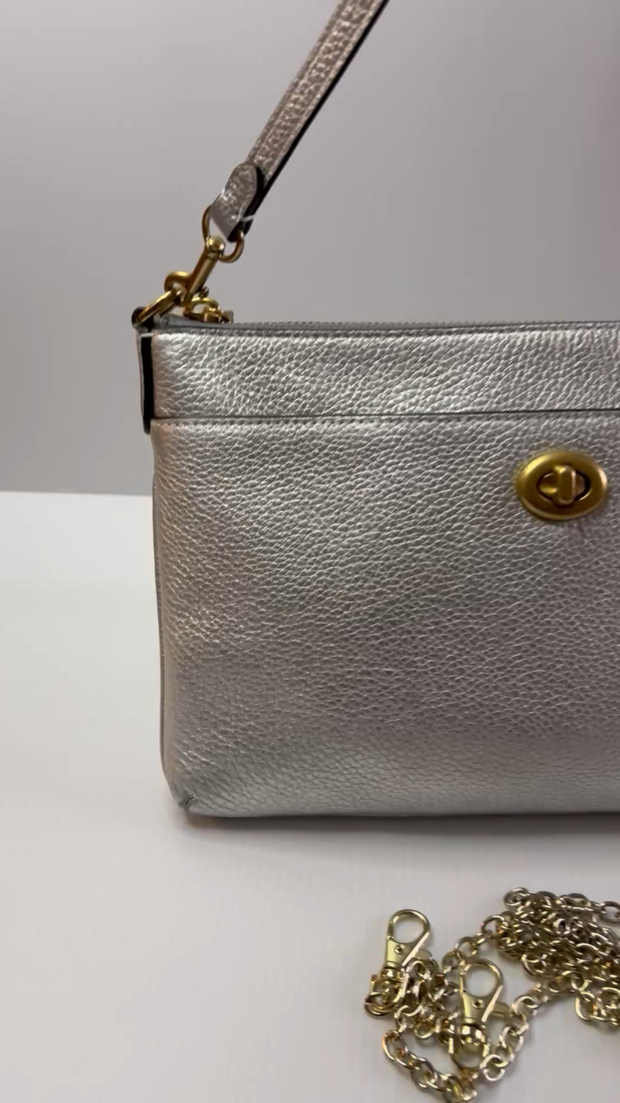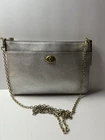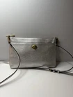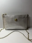Elevate your look with this stunning Coach Polly crossbody bag in metallic silver polished pebble leather. Designed for versatility and style, it features two elegant straps: the original leather shoulder strap and a detachable gold-tone chain strap for added glamour. Perfect for day-to-night transitions, this compact yet functional bag includes multiple pockets and a secure zip-top closure. Brand new with tags attached. A timeless piece for any Coach collector or fashion enthusiast. • Brand: Coach • Model: Polly Crossbody Clutch (Style No. C7202) • Color: Metallic Silver • Material: Polished Pebble Leather • Size: Approx. 10.25” (L) x 6.5” (H) x 1” (W) • Straps:• Original leather strap with approx. 23” drop • Detachable gold-tone chain strap with lobster clasps • Closure: Zip-top • Interior: Fabric lining with multifunction pocket • Exterior: Front zip pocket and open slip pocket • Hardware: Gold-tone • Style: Crossbody / Clutch / Shoulder Bag Metal strap is custom designed ✨ Shipping the Same Day 📦 Shipped with care 🔄 30-Day Free Returns (under not as described 💖 Thank you for shopping at Karo’s