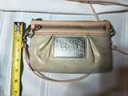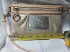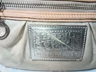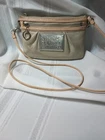 Elevate your style with the Coach Poppy Crossbody, a sophisticated accessory for the modern woman. The iconic monogram pattern, combined with a chic gold exterior, creates a timeless look that's both elegant and practical. With a small size tailored for your essentials, this bag is perfect for day-to-night use.The crossbody features a secure zip closure, ensuring your belongings are safely stowed away. The combination of black and white lining colors adds a touch of luxury, while the silver hardware provides a subtle contrast. A Peach handle/strap material offers comfort and durability, making this Coach creation a staple in any wardrobe. Cute little bag ,it does have a scratch in the front silver "Poppy" patch,also a couple marks on front top right under where the flipper is on the front part of bag. May come off with cleaning , it is in great shape inside ,no stains or rips . Handle is detachable.