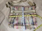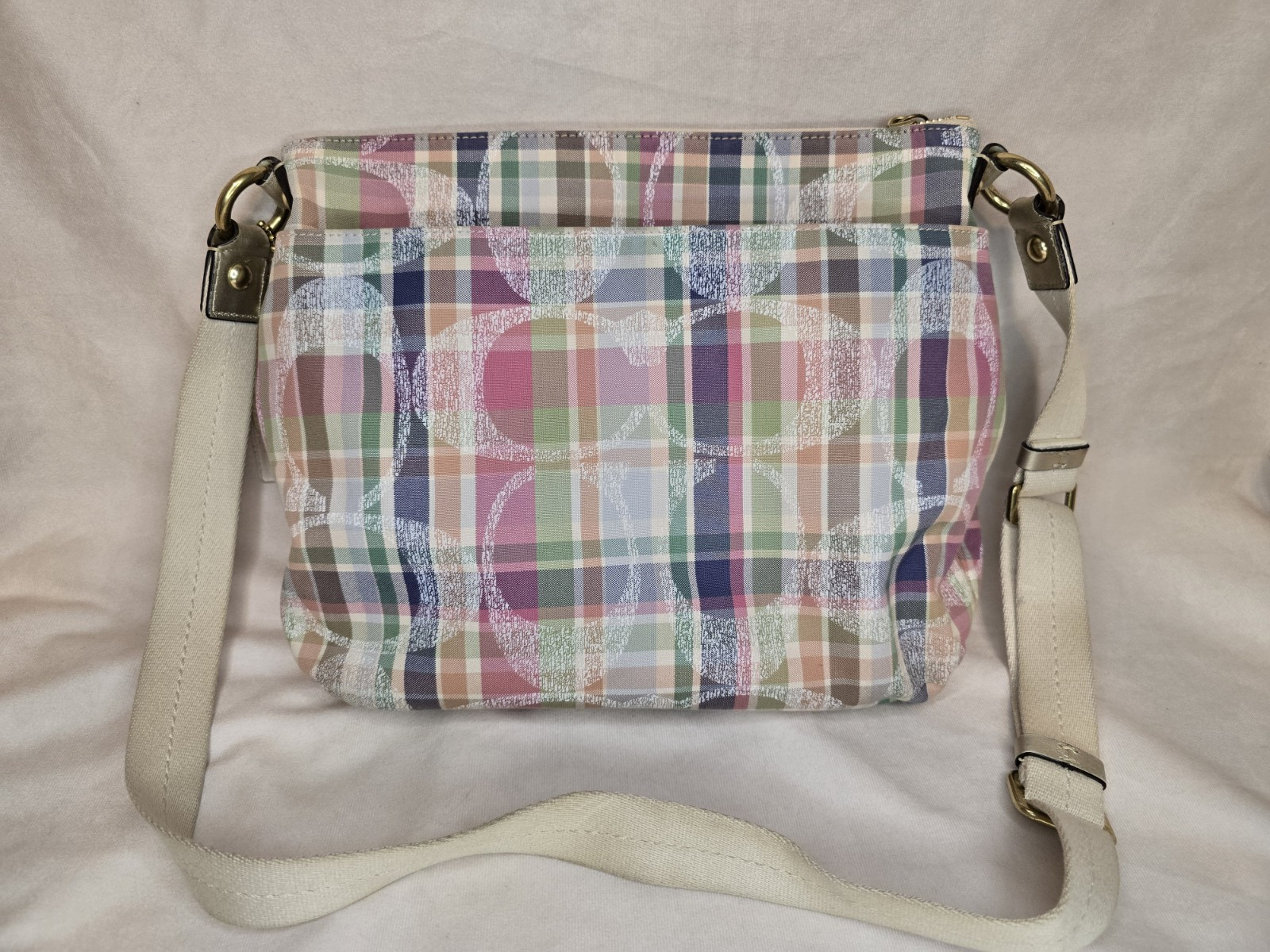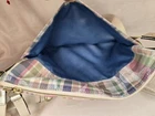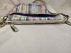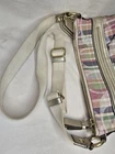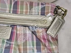 COACH POPPY MADRAS PLAID CROSSBODY BAG Great used condition Smoke and pet free home Please see all pictures for condition and measurements This Coach Poppy Daisy Glam Crossbody Purse features a Madras Tartan Plaid design in multicolor canvas with a zip closure and gold hardware. The bag has a medium size and a beige handle/strap, paired with a blue lining. It includes a bag charm and belongs to the Coach Poppy product line. P2