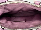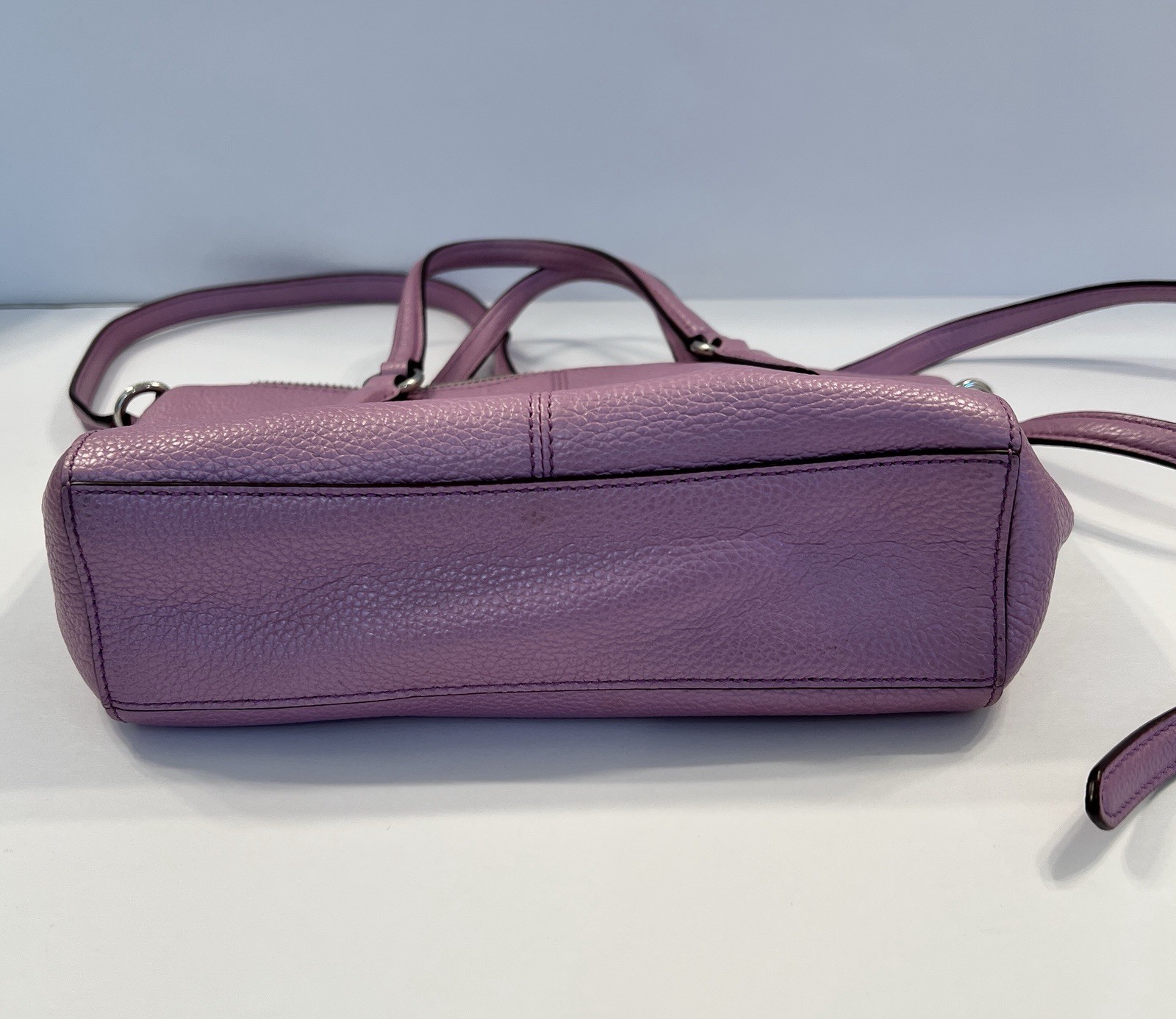 This Coach leather purse is a medium-sized shoulder bag with a purple exterior and silver hardware accents. It features a zip closure, purple shoulder strap, and inner pockets for organization. The inside on the top is a little dirty but other than that, the bag is in really good shape .