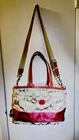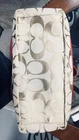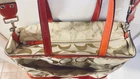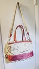 Like New and Excellent Condition! Coach Sateen shoulder bag is a stylish and versatile accessory for any woman. With a bright pink exterior and ivory lining, it features a zip closure and double handles with an 8-inch drop. The bag has a large size of 18 inches in width, 12 inches in height, and 6 inches in depth, making it perfect for travel, casual outings, or business meetings. Very clean inside and out. Used one time. No stains rips or tears. The bag also has a vintage feel with a logo pattern and silver and gold hardware. It includes several features such as a bottle pocket, inner pockets, and an adjustable strap. The nylon lining material and satin exterior material ensure durability and elegance. This Coach Sateen shoulder bag is a must-have for any fashion-conscious woman.