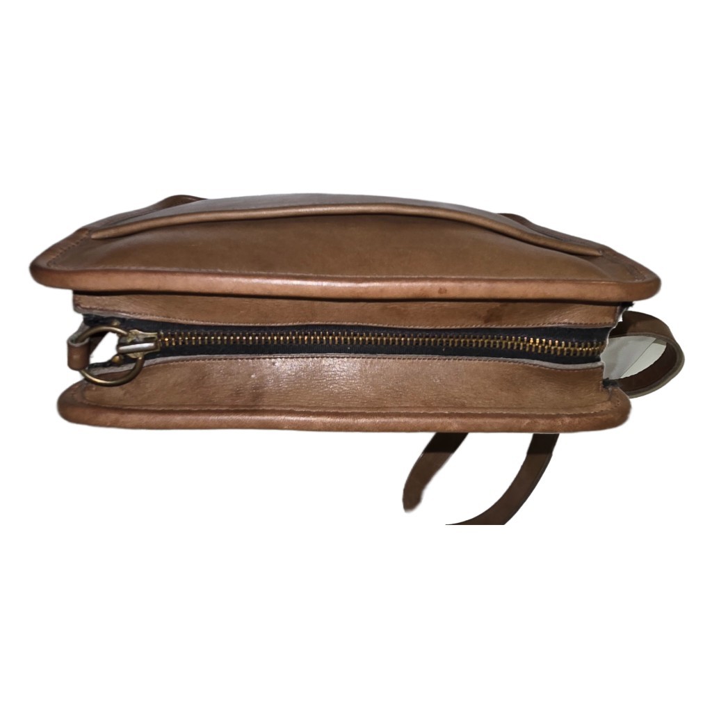 Elevate your style with this stunning Coach NYC vintage tan leather blazer crossbody bag. The bag is crafted with high-quality leather and features a rectangular shape with a zip closure. The beige handle and adjustable strap provide a comfortable and stylish way to carry the bag. This medium-sized bag has a width of 13 inches, a height of 7 inches, and a depth of 4 inches, making it perfect for carrying your essentials. The bag is adorned with gold hardware accents, including a buckle accent, strap accent, and zipper. The interior is lined with suede and features inner pockets for extra storage. This bag is perfect for travel, casual and business occasions. The Coach Blazer shoulder crossbody bag is a rare find, especially in vintage condition.
