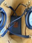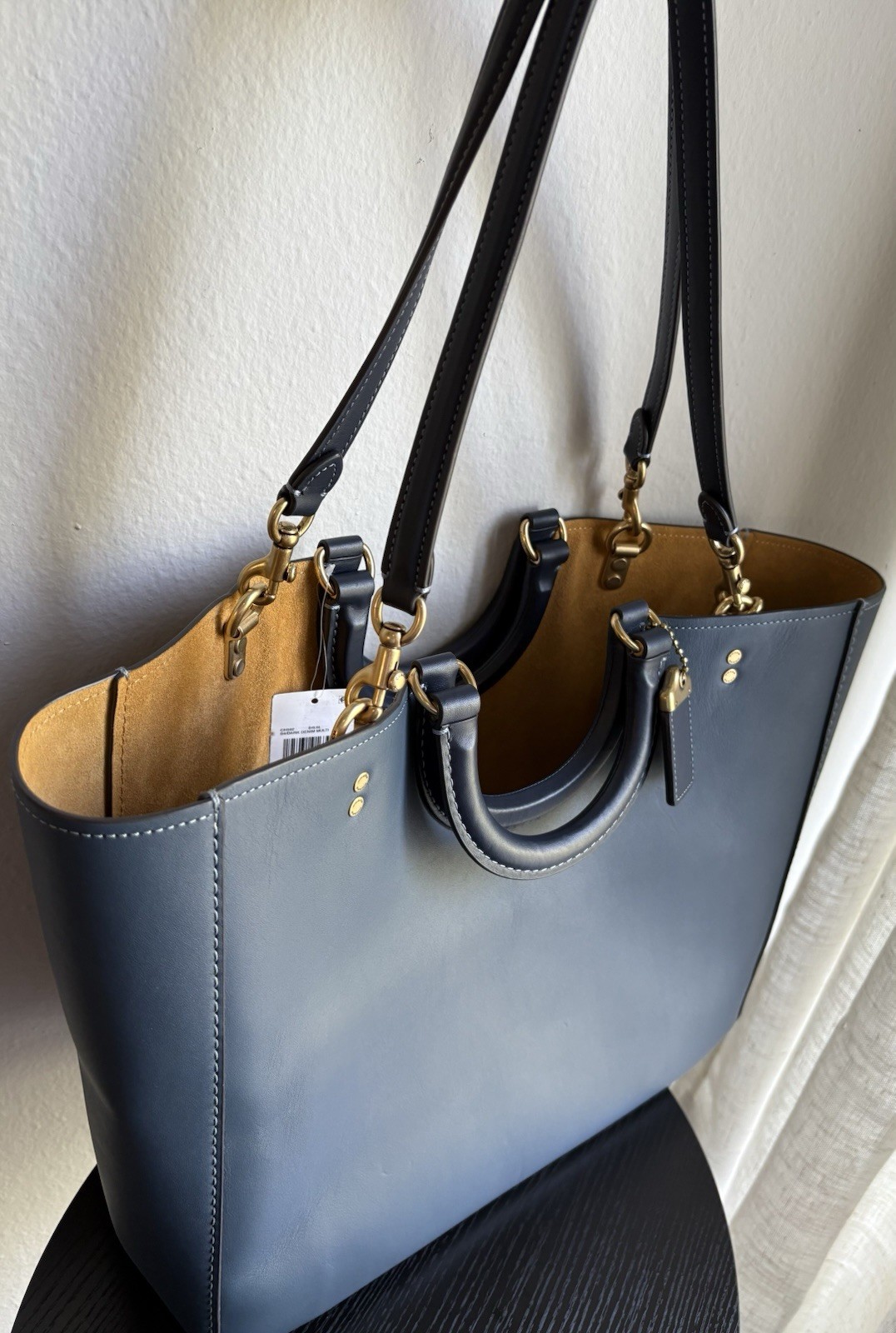 100% authentic Coach. Coach Rae tote bag. New with a few minor defects (scuffs/scratch), all circled in photos, almost unnoticeable. This was a front store display bag. Dark denim color with brass tone hardware. Glovetanned leather. Beautiful suede lining. Interior two slip pockets. VERY spacious! Detachable zip pouch. Four protective feet at base. Includes dust bag. Please look through all photos before purchase.
