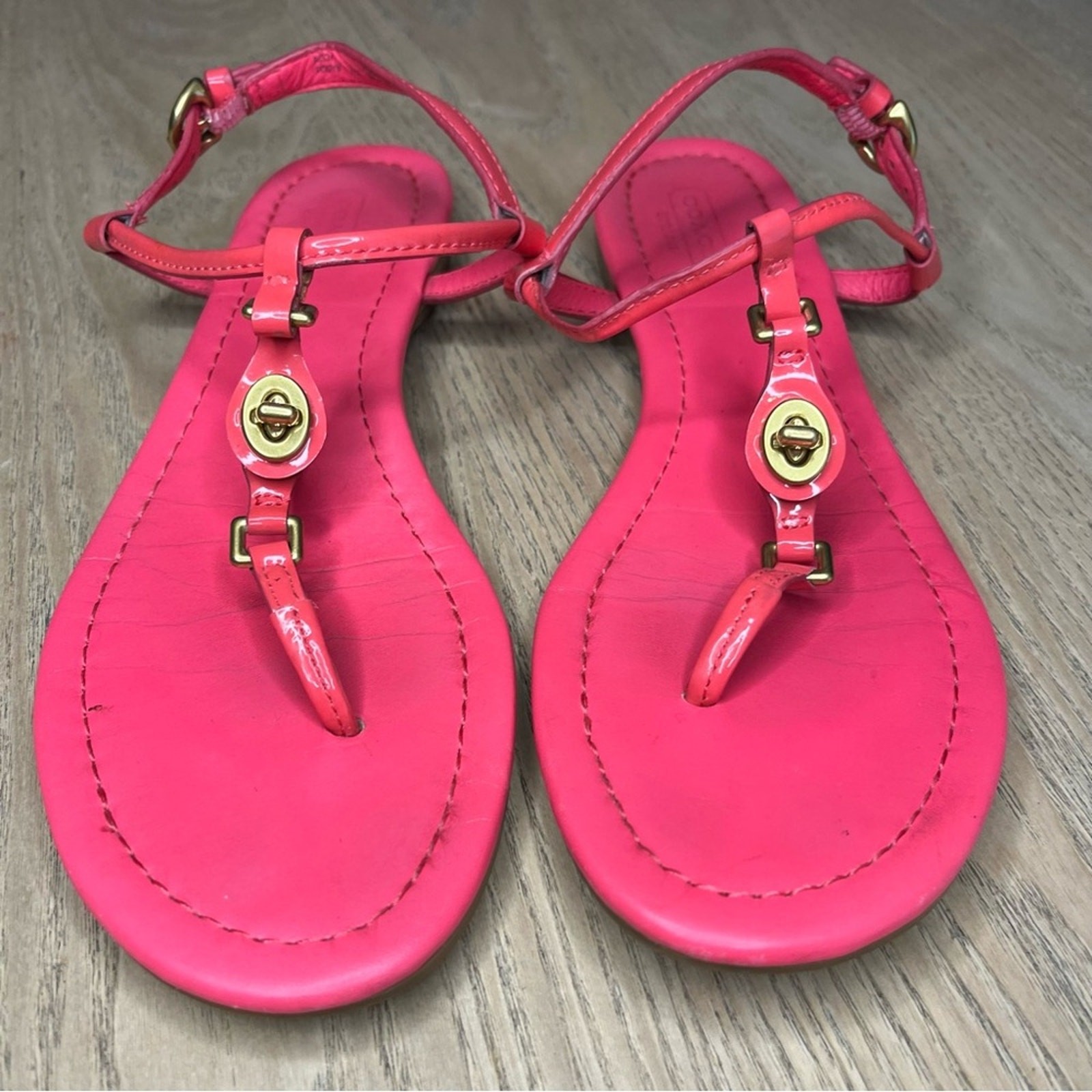 Coach Robyn Turn Lock Leather T-Strap Thong Sandals Hot Pink Women’s Size 7.5 fair condition wear from normal use Please review all photos!