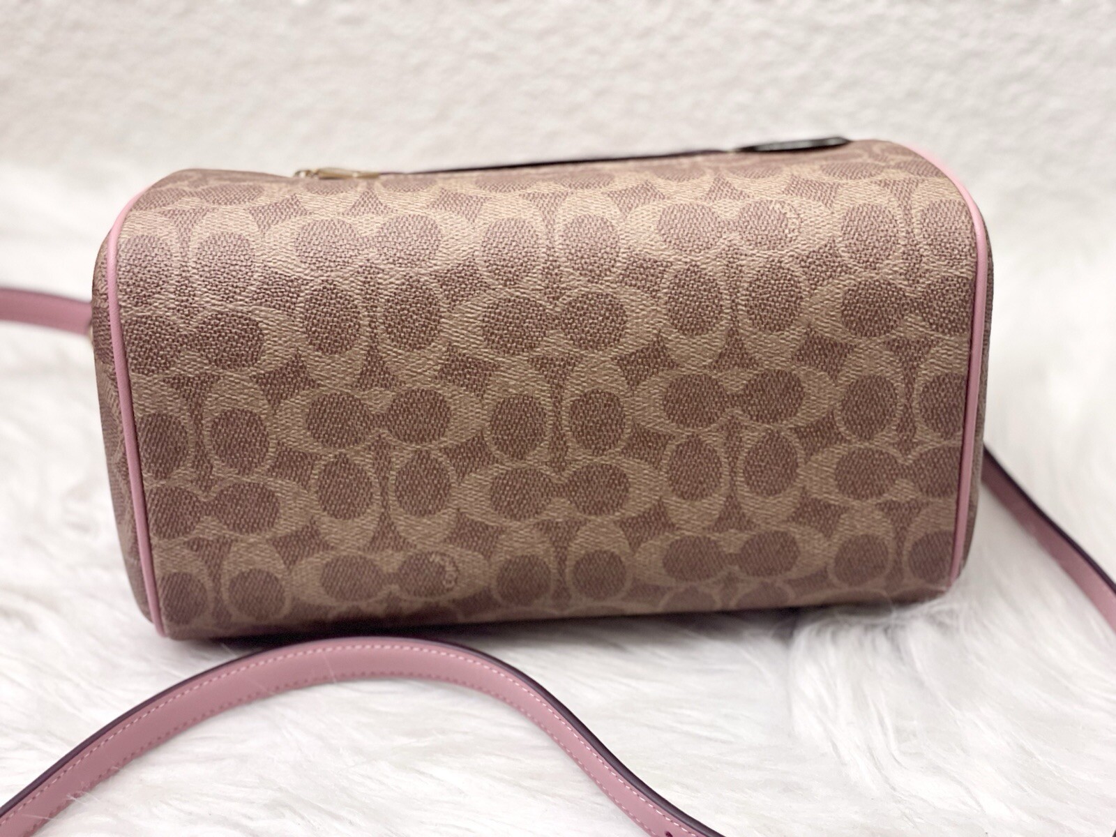 Coach Rowan Satchel Bag In Signature Canvas Brand new with tags 100% Authentic Limited Edition Color: Tan/ Pink petal Style Number CV961 Measurements Length: 10.0" Height: 6.5" Width: 5.5" Materials Signature coated canvas Fabric lining Handle Handles with 4.25" drop Strap Detachable strap with 23" drop for shoulder or crossbody wear Features Outside zip pocket Zip and multifunction pockets Zip closure Price is firm