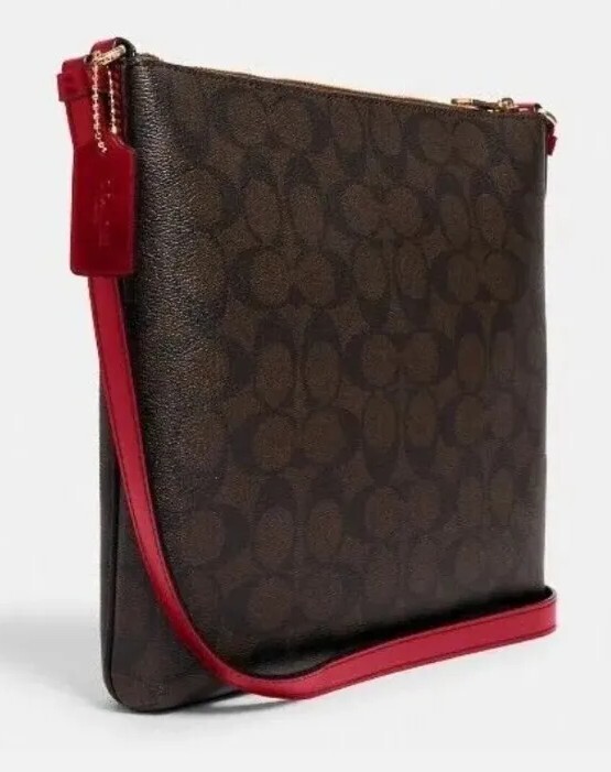 Elevate your style with this exquisite Coach C1554 Rowan File Bag in Signature Canvas. The bag is designed with a rectangular shape and a zip closure. It features a crossbody strap with a red handle and a red and gold hardware color that adds a touch of sophistication to your outfit. This versatile bag is perfect for any occasion, whether it's for travel, a party, casual or formal events, or business meetings. It has a small size with a bag width of 10 1/4", a bag depth of 9 in, and a bag height of 9 3/4". The bag is equipped with inner pockets, an adjustable strap, and a zipper accent that makes it easy to organize your essentials. The bag is also coated with a signature finish and has a lining material of fabric with a brown lining color.