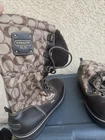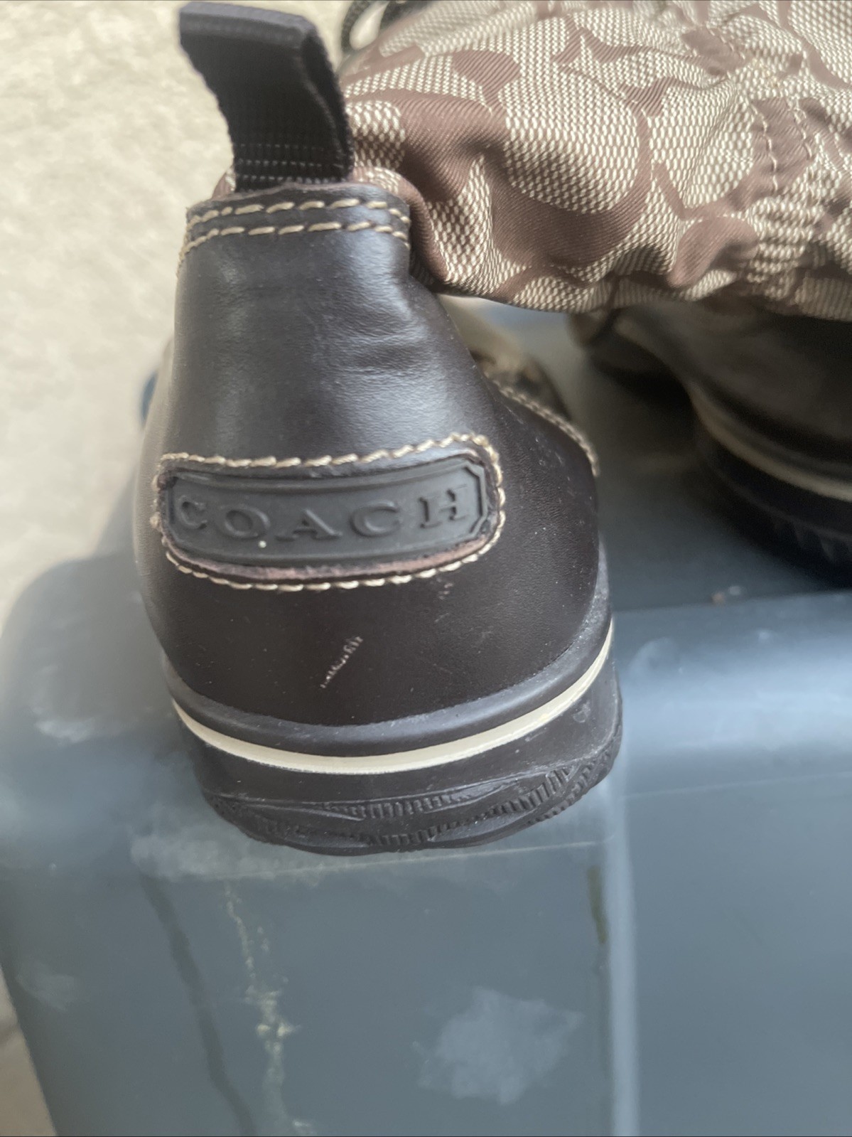 The product is a pair of Coach Shane Brown & Beige Rain Boot Shoes in women's size 9.5. These stylish and fashionable boots are perfect for rainy days, featuring a versatile brown and beige color combination. The Coach brand is known for its high-quality and trendy shoes, making these rain boots a chic addition to any woman's wardrobe. With a UK size of 7.5 and AU size of 9.5, these boots are designed to provide both comfort and style for any woman looking to make a fashionable statement.