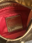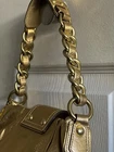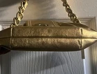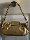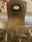Elegant gold shoulder bag with Bronze hardware, pink interior, leather in amazing shape even through out these years, this bag will never go out of style, zip and cross lock closing. Measurements 10" L x 1"W 4"H Strap drop : 16 " Send offers! And thank you for shopping <3