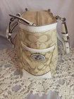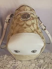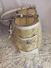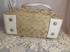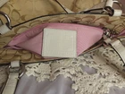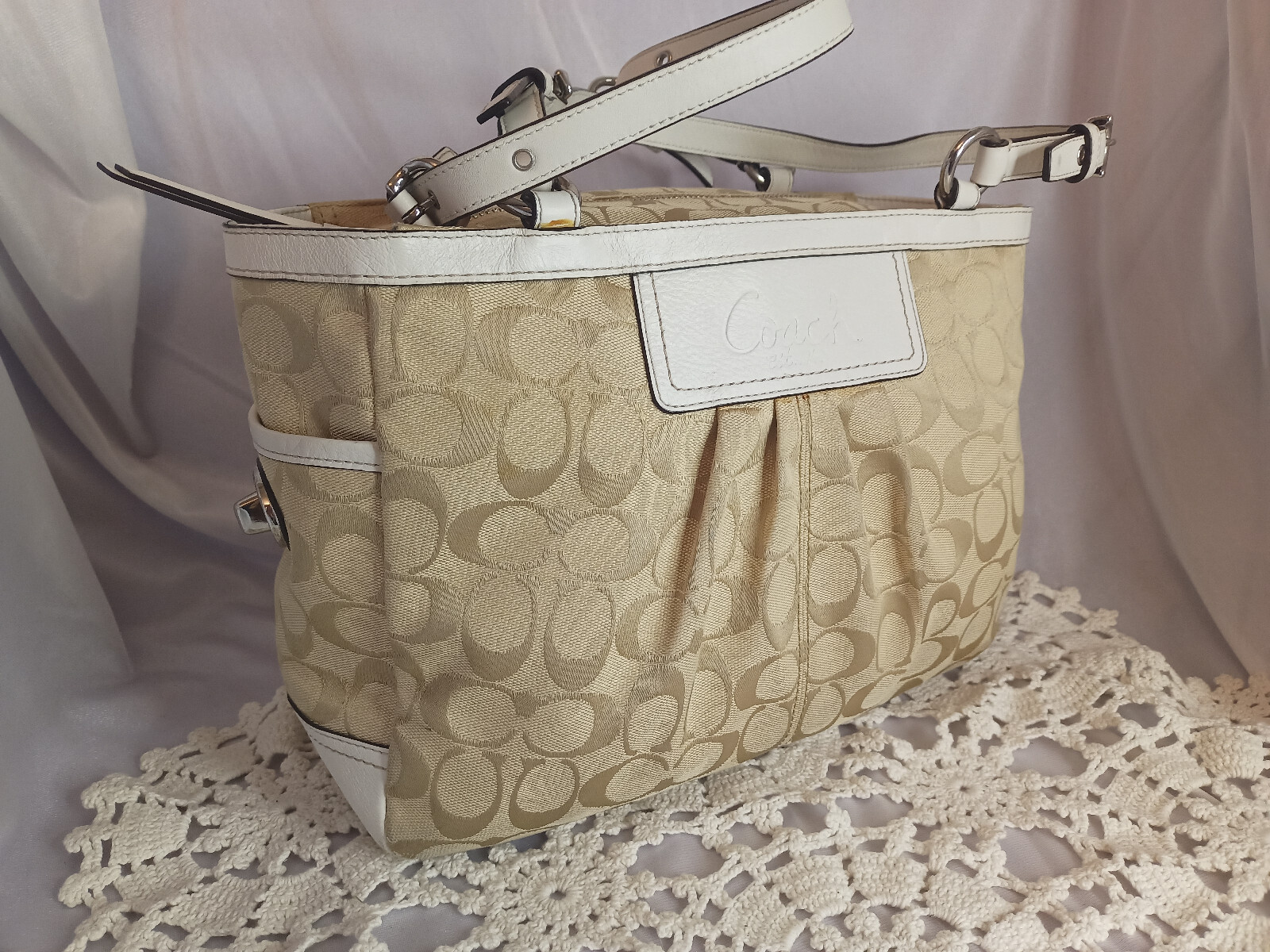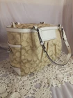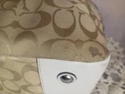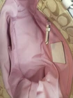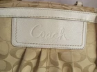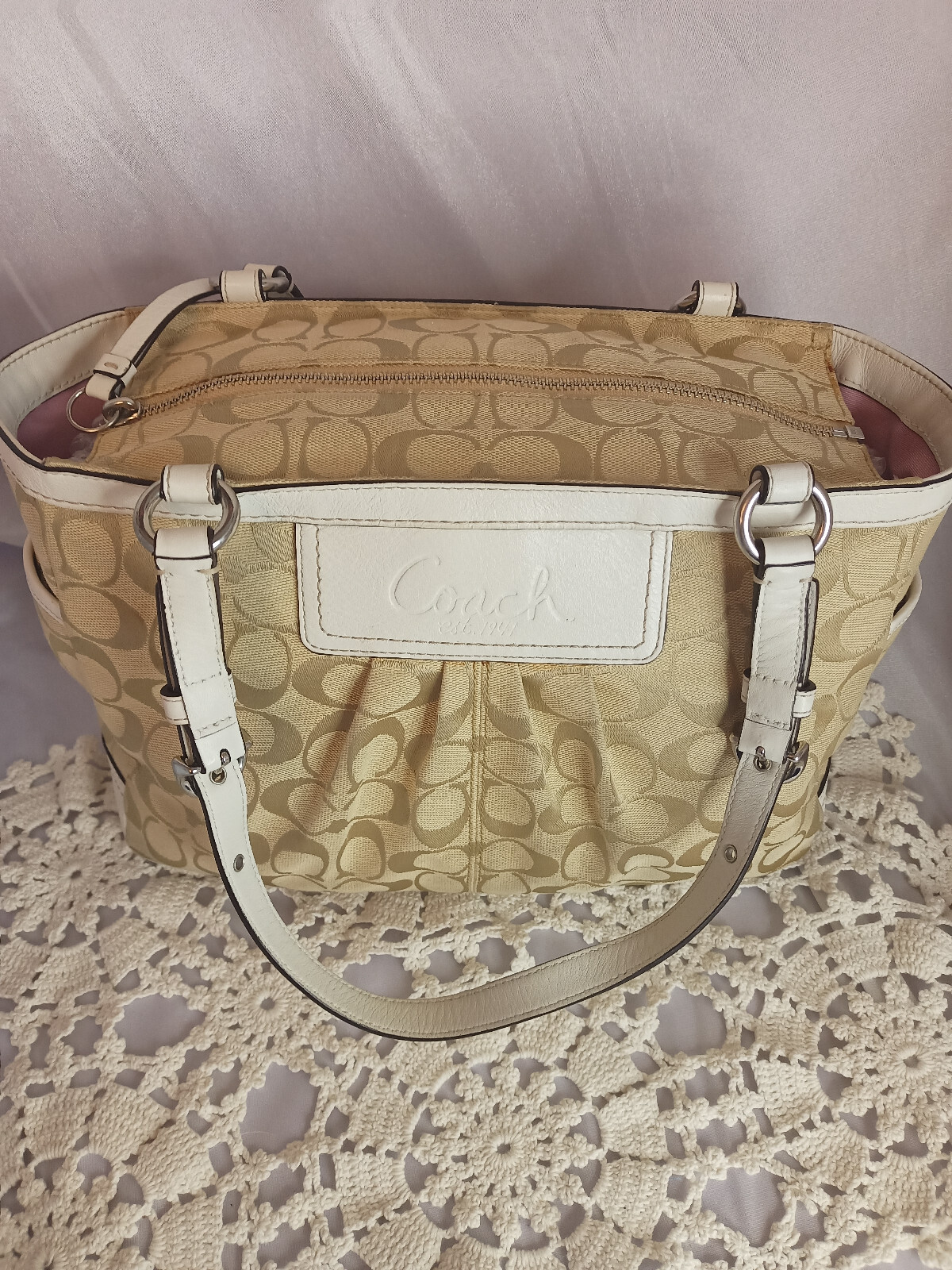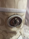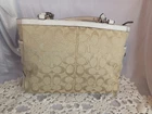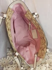 This Coach Signature Gallery Tote features a beige jacquard exterior with the brand's logo pattern and ivory leather double handles. The medium-sized bag has a rectangular shape with a zip closure and silver hardware accents, including a zipper detail. The interior is lined with pink fabric and includes multiple pockets for storage. The versatile design and subtle color scheme make this tote a stylish and functional choice for women on the go.