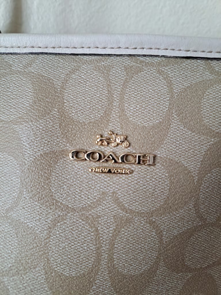 Coach Signature Beige Shoulder Bag Tote Bag. Preowned; well loved. The bag has stains on the inside under the zipper. There is wear on all four corners and on the handles. See photos. Sold as is. Measures 15.5" X 10.25" X 5".