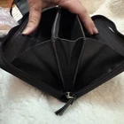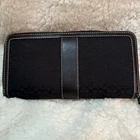 This is a Coach Signature Black Accordion Zip Around Long Wallet made of leather and PVC materials with a canvas fabric type. It measures 7.5 inches in length and 4 inches in width, featuring a zipper closure and the Coach logo. The wallet is designed for women and includes credit card slots.