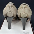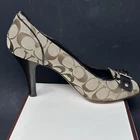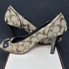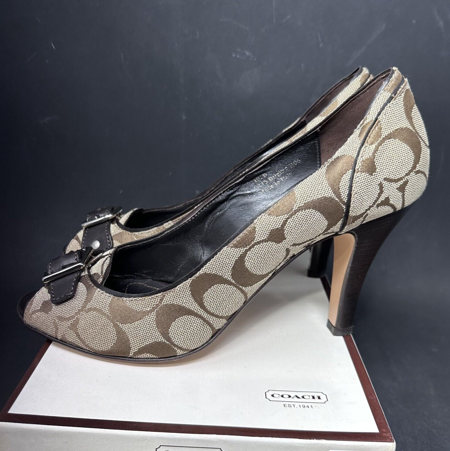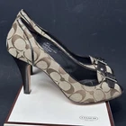 Theme:SignatureStyle:PumpCustomized:NoSeller Notes:“Good Condition - See Pictures for Best Description”Product Line:Coach SignatureToe Shape:Open ToeInsole Material:LeatherShoe Width:BHeel Style:StilettoType:HeelPersonalize:NoCountry/Region of Manufacture:ItalyAccents:LogoUpper Material:FabricHeel Height:High (3-3.9 in)Closure:Slip OnOutsole Material:LeatherVintage:Nogtin13:Does not applyBrand:CoachPattern:SignatureDepartment:WomenUPC:Does not applyUS Shoe Size:10Color:BrownFeatures:Logo