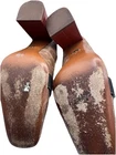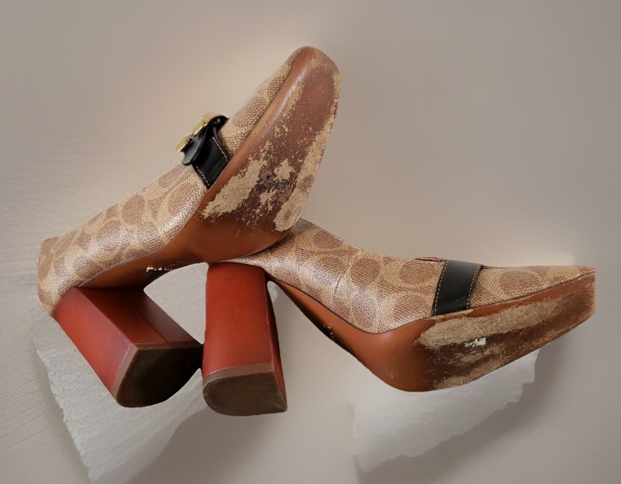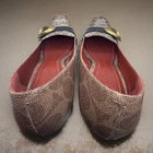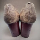 Authentic Coach signature C canvas pumps featuring a comfortable block heel and distinctive brass-tone buckle detail with black leather strap across the vamp. These classic pumps showcase Coach’s iconic horse and carriage logo on the insole. Design Features: • Signature Coach C pattern canvas upper • Black leather decorative strap with brass buckle accent • Snakeskin-textured panel detail • Block heel for comfortable all-day wear • Leather insole with Coach branding • Square toe design Condition Notes These shoes are in well-worn, used condition and show significant signs of wear consistent with regular use: Please Review Photos Carefully: • Leather soles show heavy wear with visible discoloration and deterioration • Scuffing and wear marks visible on outer canvas material • Heels show wear on bottoms • Upper material shows general use • Hardware and buckles remain intact These shoes are sold AS-IS and would benefit from professional cleaning or sole replacement. Perfect for someone looking for authentic Coach shoes at a budget price or for restoration.