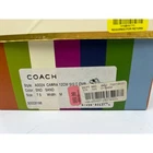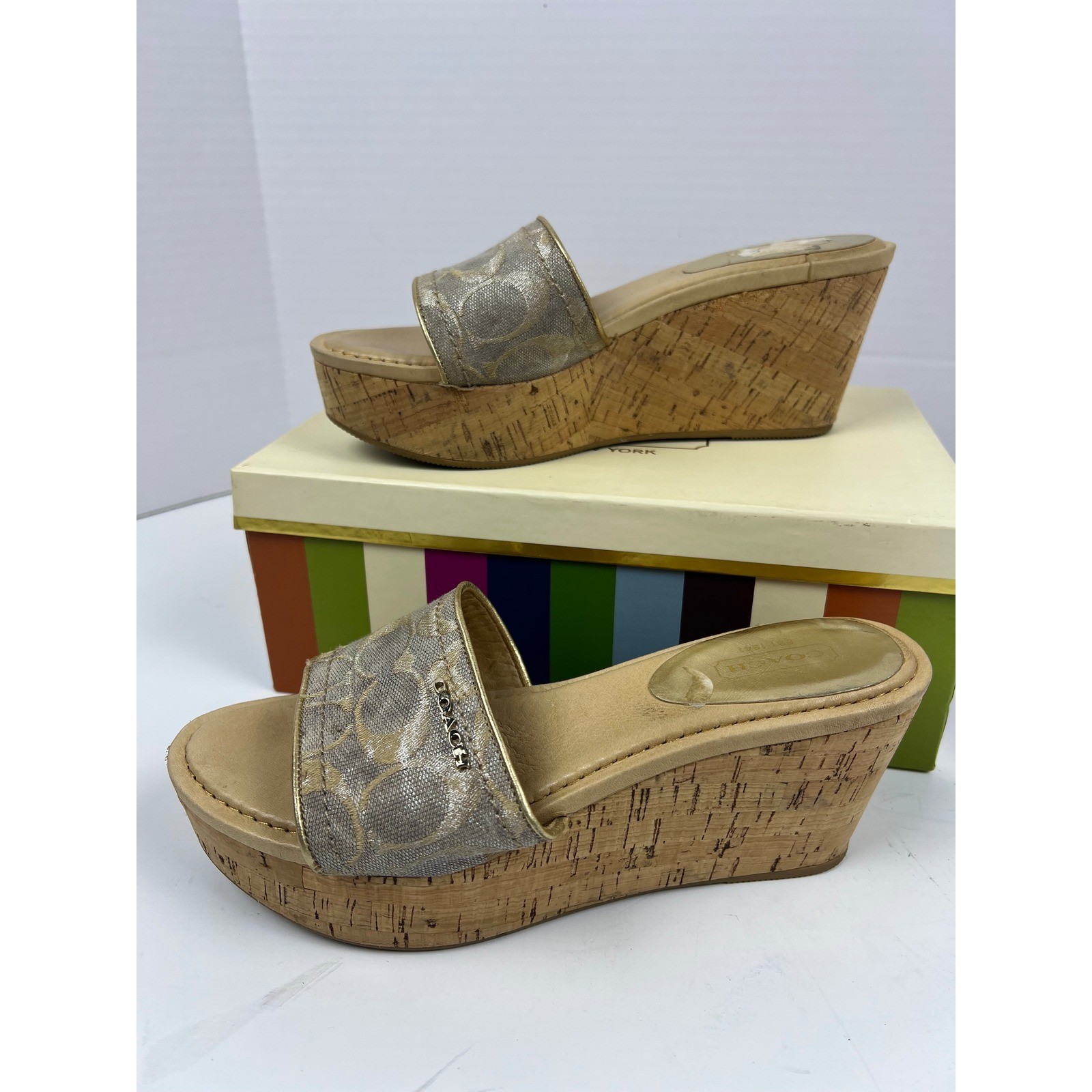 Elevate your warm-weather wardrobe with these stunning Coach Signature C Monogram wedge slides. The iconic Coach 'C' monogram fabric adorns the elegant strap, complemented by a gleaming gold trim that catches the light with every step. The natural cork wedge offers a comfortable and stylish lift, providing a chic silhouette that effortlessly transitions from casual daytime outings to sophisticated evening events. Perfect for a beach vacation, a stylish brunch, or a summer garden party. Comes with original box and paper Wear from light use Measurements: • Heel Height: 4.5 in • Platform Height: 1.5 in Style: Slide Department: Women Upper Material: Cork Heel Style: Wedge Features: Comfort Closure: Slip On Pattern: Geometric Accents: Logo Heel Height: Ultra High (4 in & Higher) Type: Sandal Keywords: Coach sandals, wedge slides, monogram print, cork heel, summer fashion, designer footwear, signature pattern, platform sandals, tan wedges, resort wear, chic style, casual elegance, outdoor events