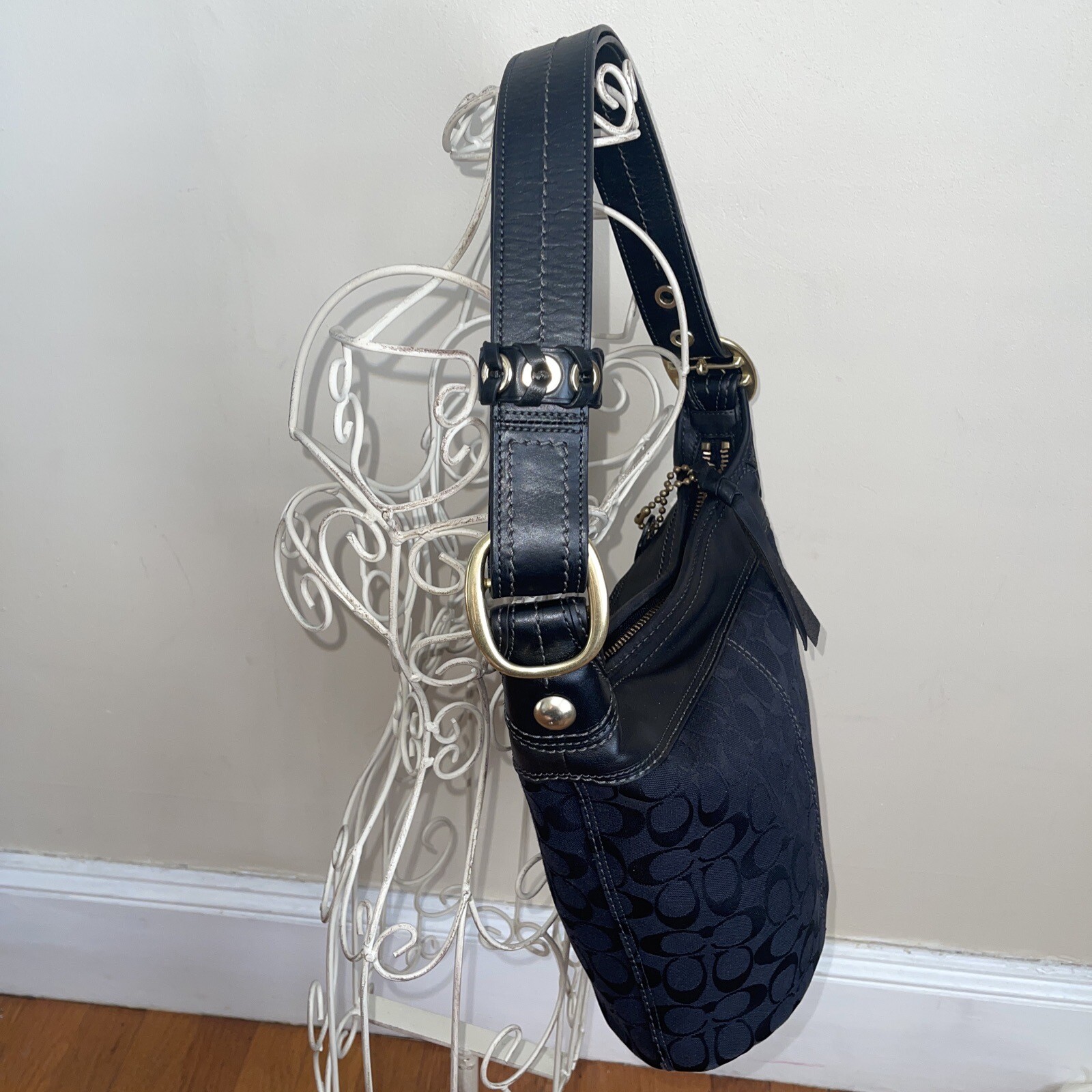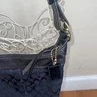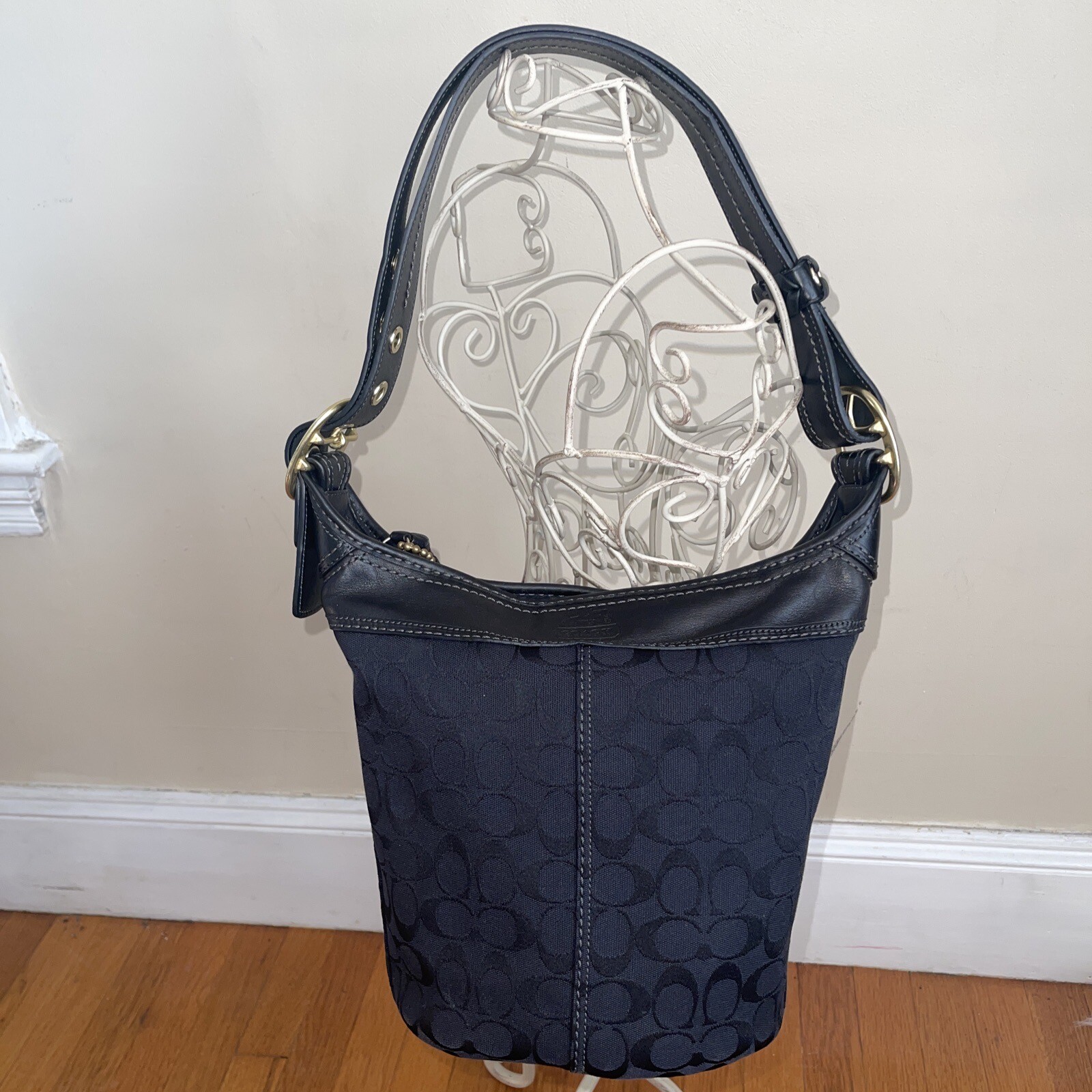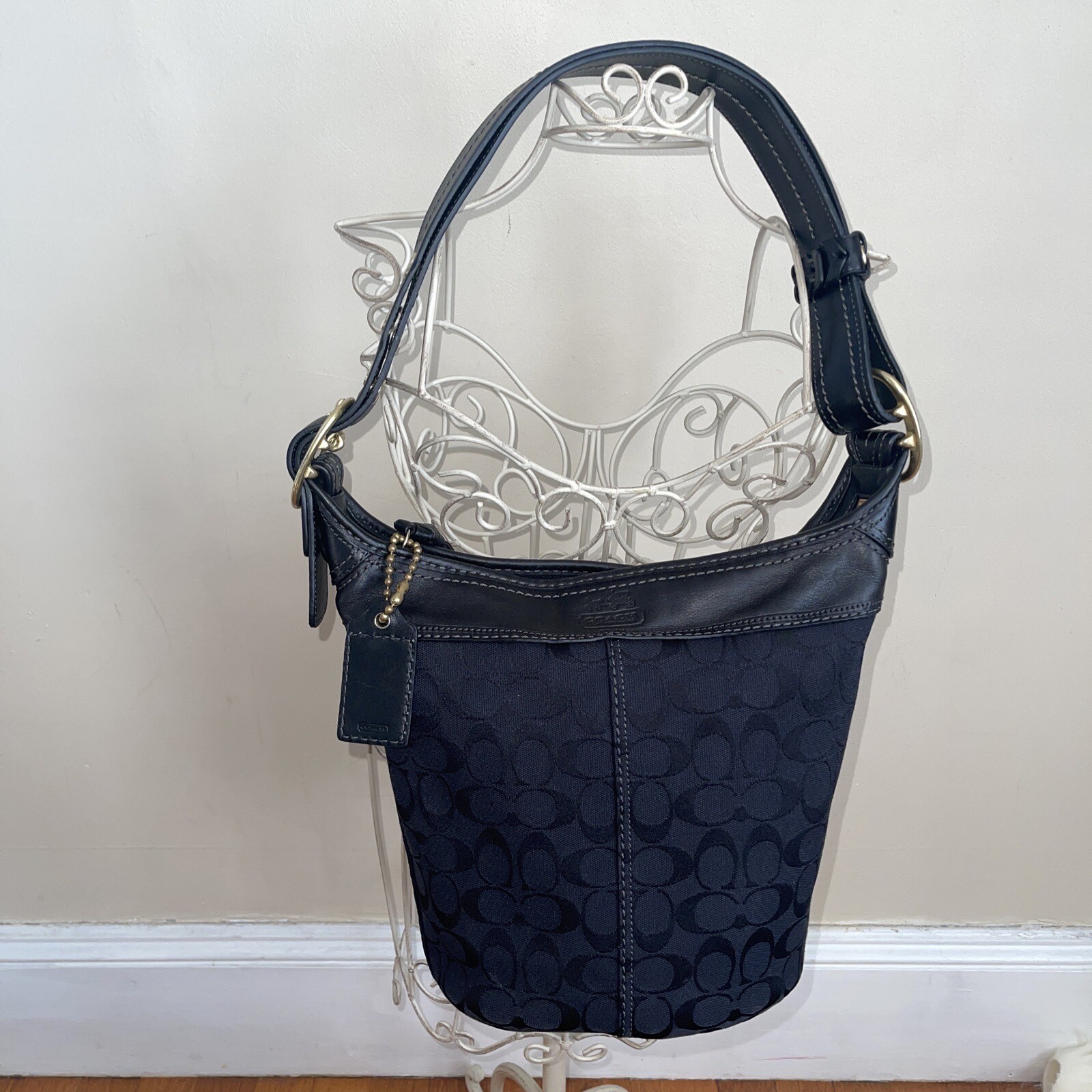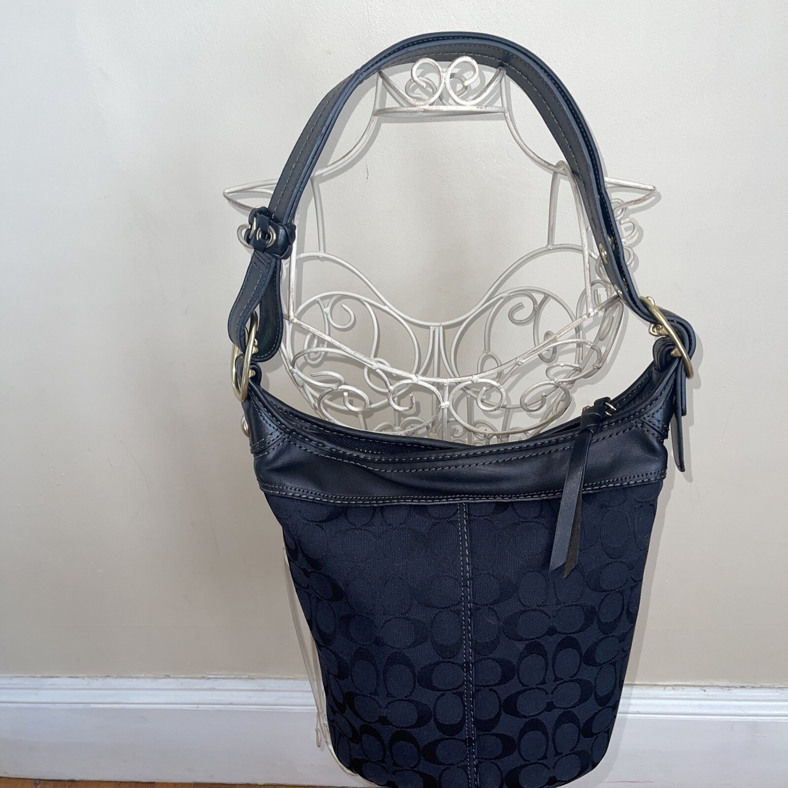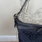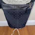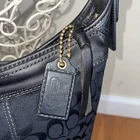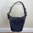 Coach Signature Canvas Bucket Shoulder Bag (Authentic): Zippered pocket inside and two pockets for cellphone and keys. Zippered closure, gold hardware. Black, traditional Coach logo. Gold metal detail. 11" X 11" X 5.5" Strap drop: 24"