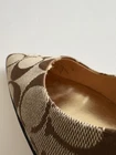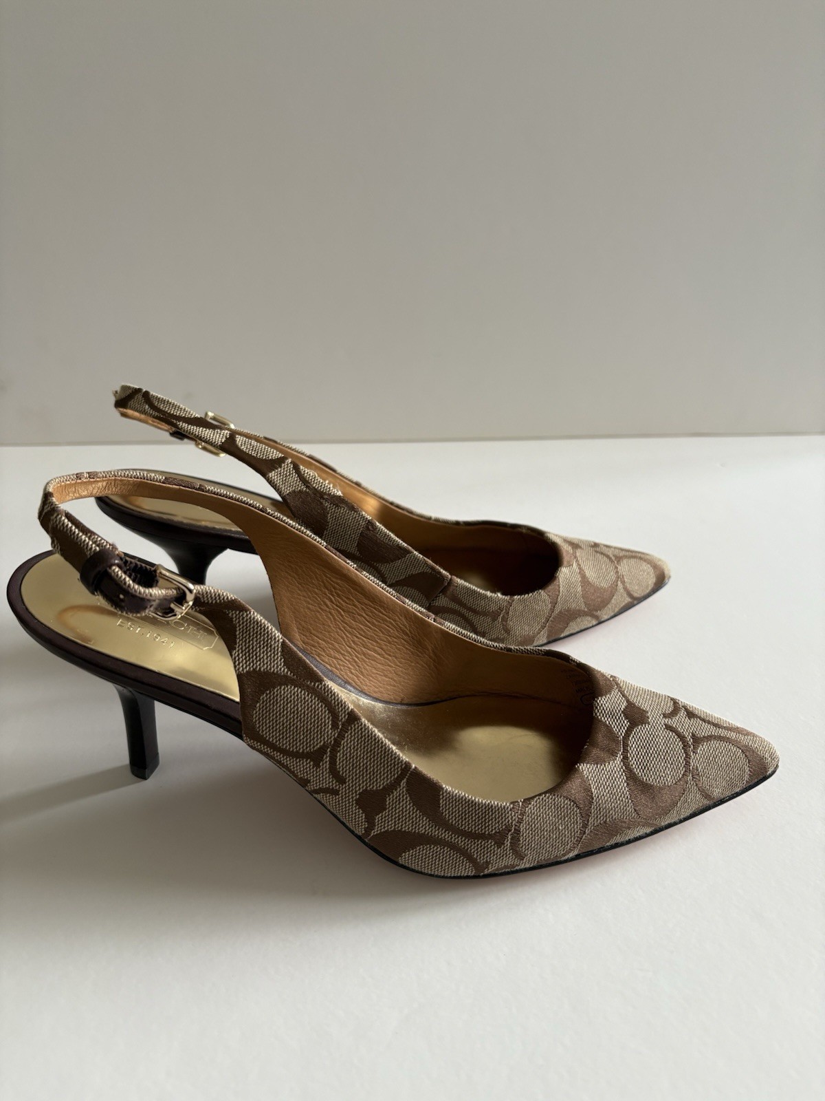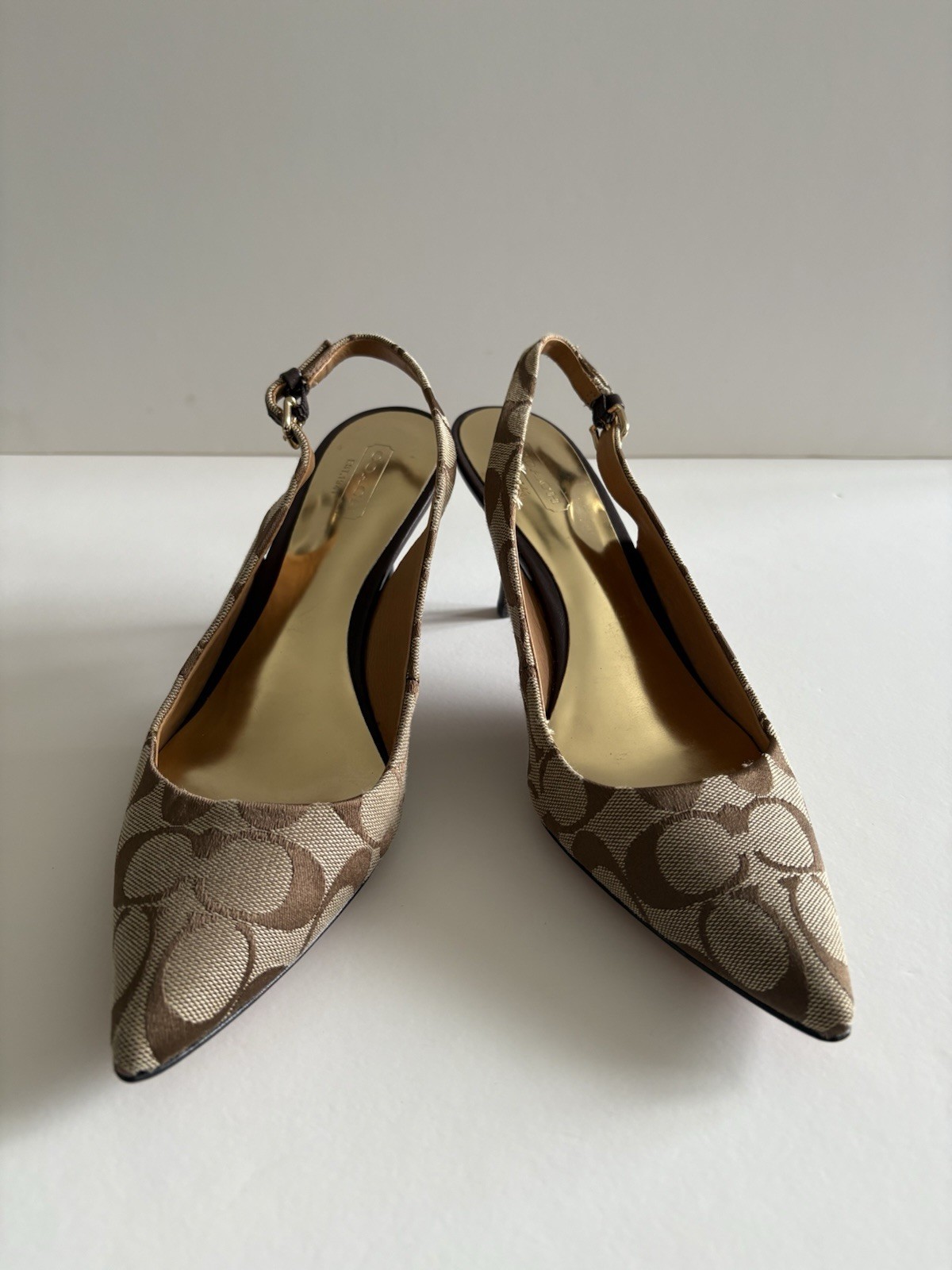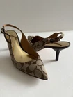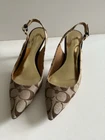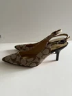 Step out in style with these elegant Coach slingback heels, featuring the iconic Coach signature canvas design. Perfect for work, events, or a chic day out, these shoes offer a refined silhouette with a pointed toe and adjustable ankle strap for comfort and style. Details: • Brand: Coach • Style: Slingback Heels • Color: Beige/Brown with Signature “C” Canvas Pattern • Material: Fabric upper with leather lining • Toe Shape: Pointed • Heel Height: Approx. [3-1/2] • Closure: Adjustable buckle strap • Condition: Gently Used. Size: 7.5 Shipping: Ships within 1 business day
