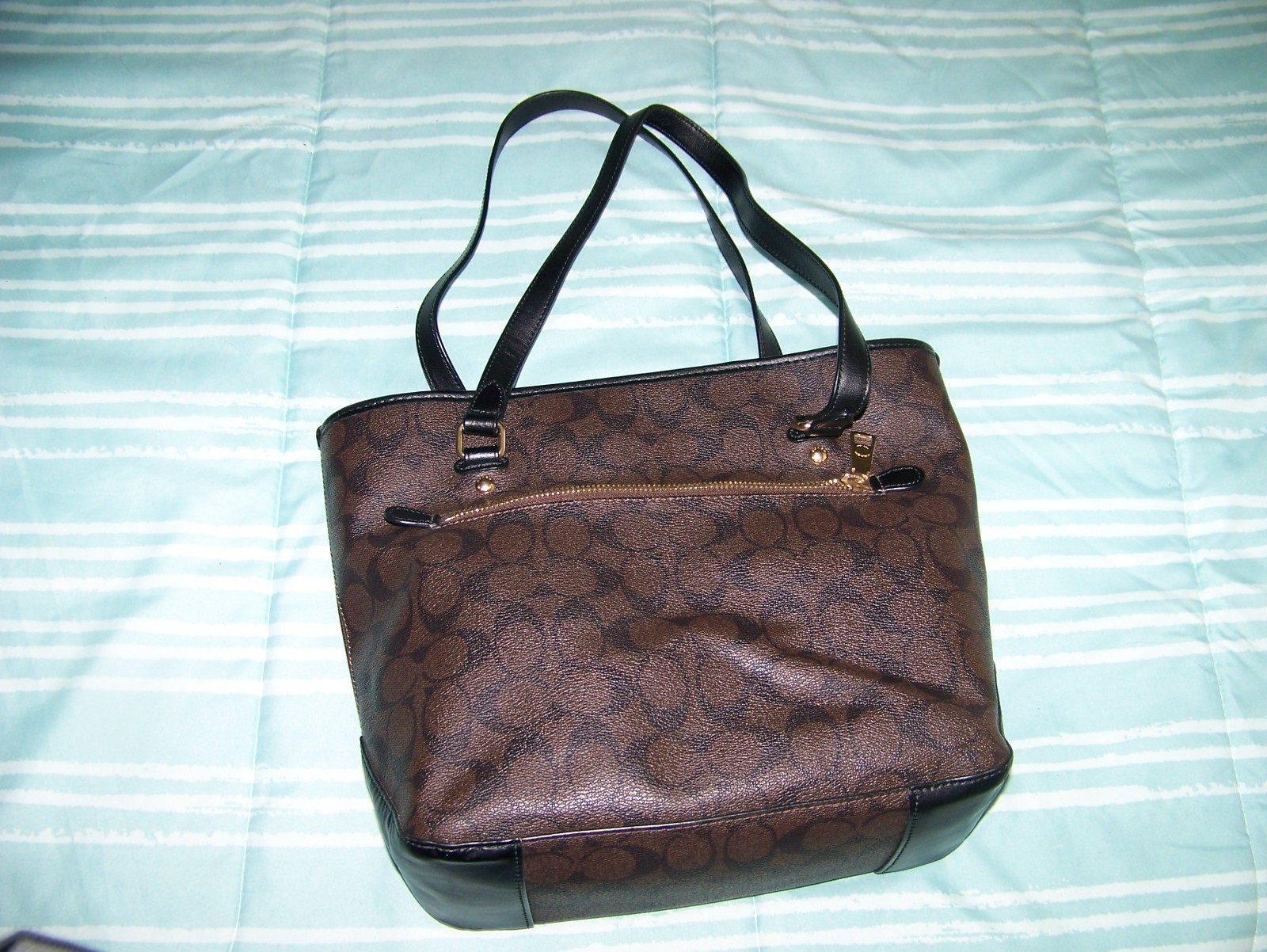 Coach Zip Top Tote #F58294, Signature Logo brown/black with black cloth lining, gold hardware with Coach hangtag and leather straps. Outside zip pocket with large inside zip pocket and 2 non zip pockets for possibly cell phone and/or glasses. 13.5" length, 10.25" height, 4.5" depth. Used condition, personal collection.