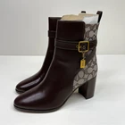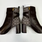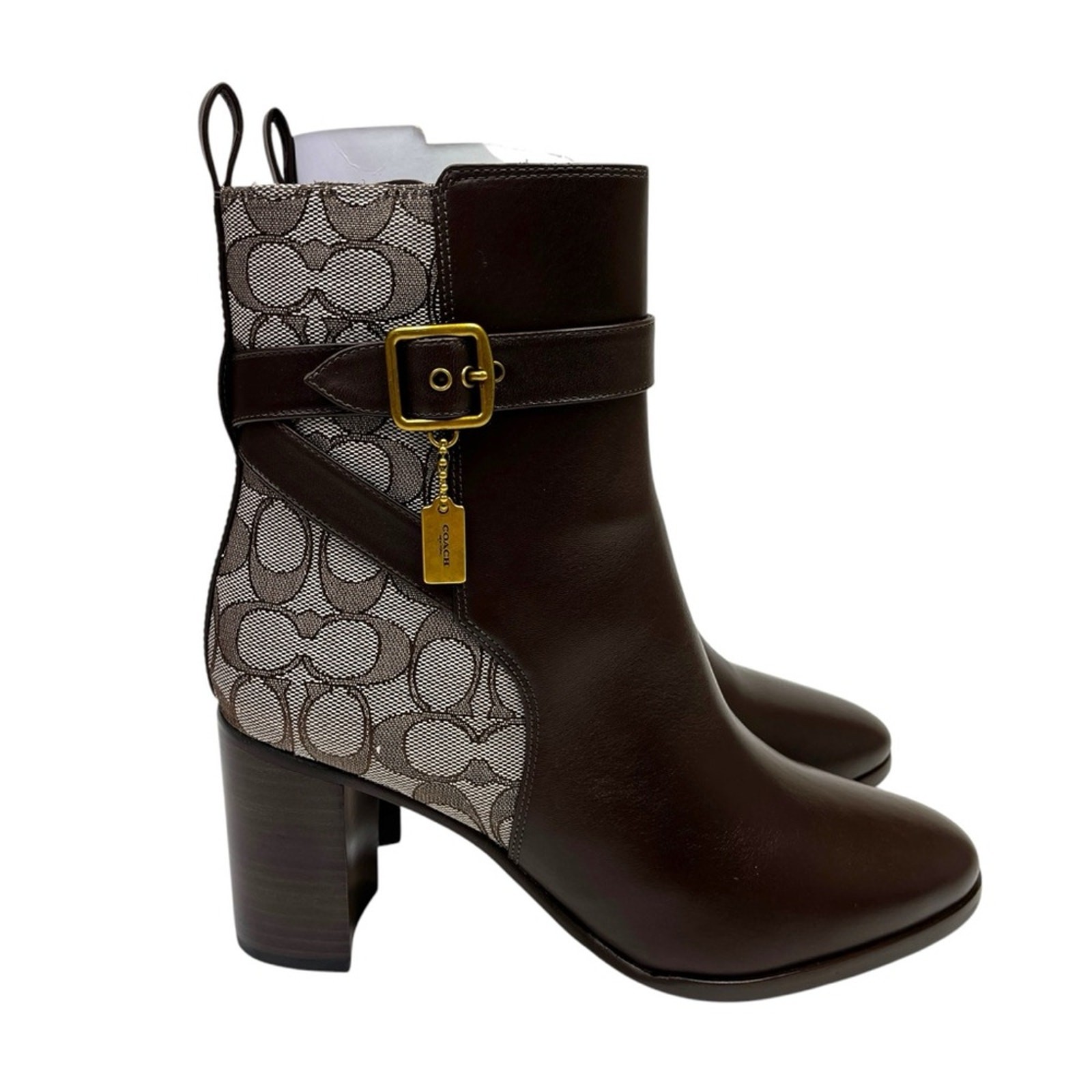 Coach Signature Jacquard Olivia booties oak maple - 9.5B Brand: Coach Size: 9.5B Type: Booties Color: Oak/Maple Closure: Zip Condition: New In Box Coach Signature Jacquard Olivia Booties in Oak/Maple. Say hello to your new go-to boot. Crafted in a mix of smooth leather and our Signature jacquard made with a blend of organic cotton and recycled polyester, our sophisticated mid-calf Olivia bootie features cushiony memory foam padding for all-day comfort and a sturdy block heel. It’s finished with an archival buckled strap and a mini hangtag charm for an iconic Coach touch. NWT - retail $295 Going Out Winter, Fall, Winter, Cold Weather, Timeless, Romantic, Preppy, Casual, Quiet Luxury, Versatile, Leather, Chic, Trendy