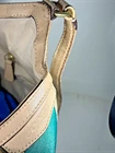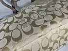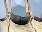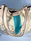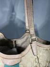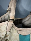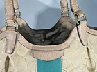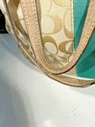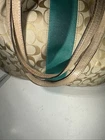 The Coach Signature Khaki Emerald Stripe Devin Shoulder Bag is a stylish and versatile handbag designed for women. This shoulder tote features a classic striped pattern in khaki and emerald colors, with a jacquard exterior material. The bag is spacious, with dimensions of 10 inches in height, 18 inches in length, and 6 inches in depth. The shoulder strap has a drop of 10.5 inches, making it comfortable to carry. With the iconic Coach brand and timeless design, this handbag is a chic accessory for any outfit.