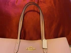 The Coach Large Leather Tote Bag is a stylish and spacious accessory designed for women. Made from high-quality leather in a pebbled finish, this rectangular tote features a baby pink exterior with gold hardware accents. It includes a zipper closure, double pink leather handles, and inner pockets for organization. This designer bag is an ideal choice for everyday use, adding a touch of luxury to any outfit. The Coach brand ensures both quality and fashion-forward design, making this tote a must-have for the modern woman.