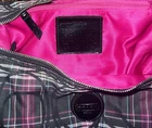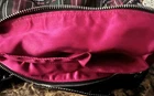 Preowned Coach Handbag. Beautiful colors of black, silver, magenta and teal. All zippers function properly. Two inside pockets and a zip compartment. Does have slight damage to the handle. Slightly frayed on one side. (Please see last two photos.) ABSOLUTELY NO RETURNS!