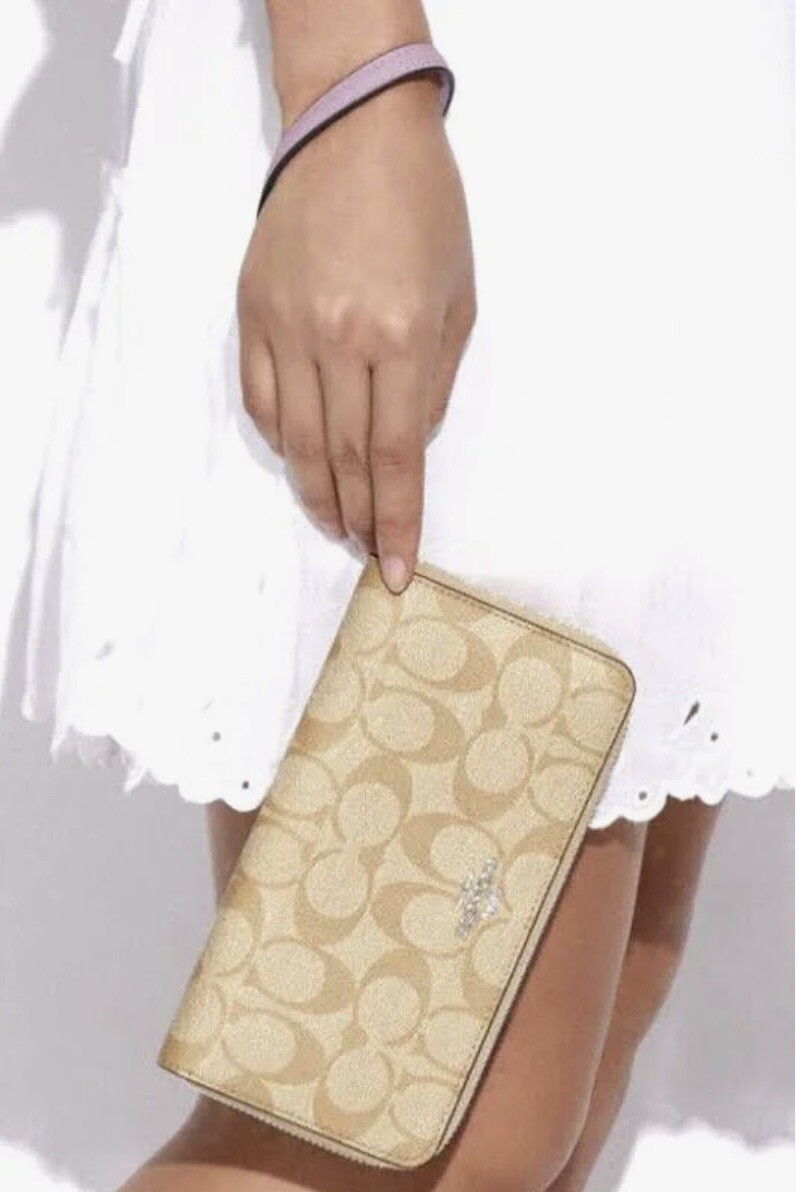 New with tags 100% Authentic Coach C4452 Long Zip Around Khaki / Ice Purple with Silver tone hardware Signature Coated Canvas and smooth Leather Twelve credit card slots Full-length bill compartments Inside zip coin pocket Zip-around closure Detachable wrist strap Length: 7 1/2" Height: 4" Depth