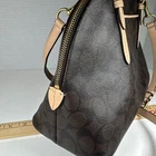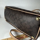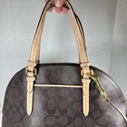 Add a touch of sophistication to your wardrobe with this Coach F26184 Signature Petyon Cora Brown Coated Canvas Domed Satchel Bag. The bag features a zip closure and a medium size, making it perfect for everyday use. The exterior color is brown, and it is made of PVC and coated canvas, while the lining material is canvas. The bag has a satchel style and comes with a strap accent. It is a great addition to any outfit and is perfect for carrying your essentials.