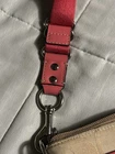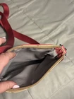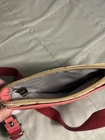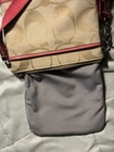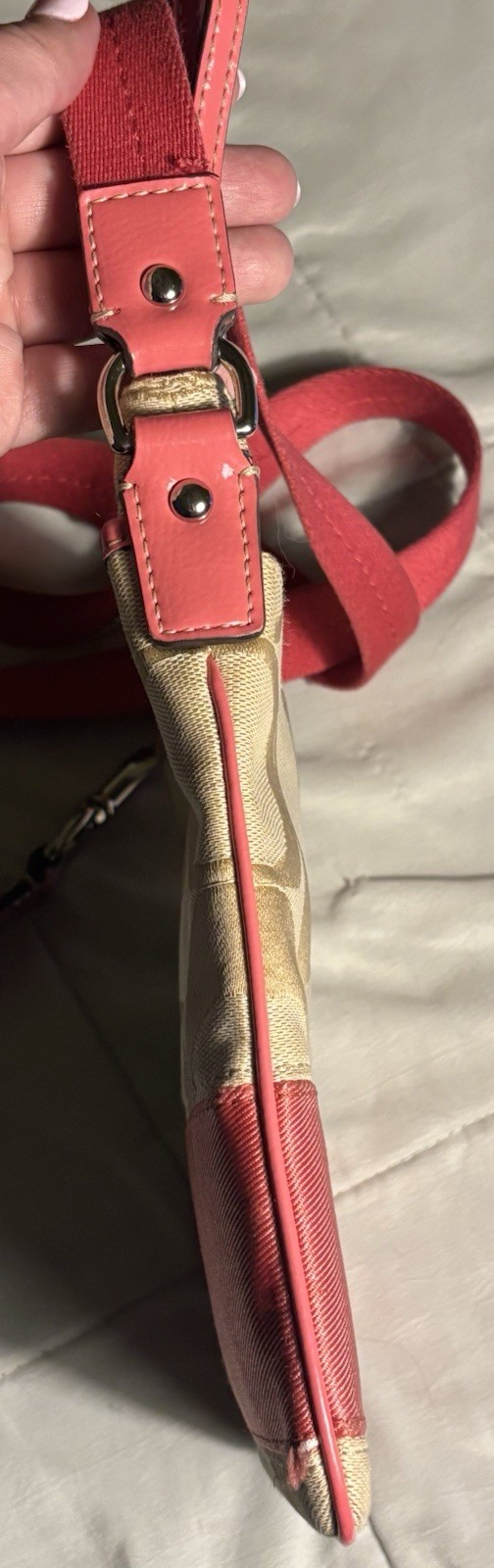 The Coach Signature Pink and Tan Swingpack Crossbody is an adorable 2000s styled purse. Made of canvas with a logo pattern, this small rectangular purse features a zip closure and a crossbody strap handle style with silver hardware.