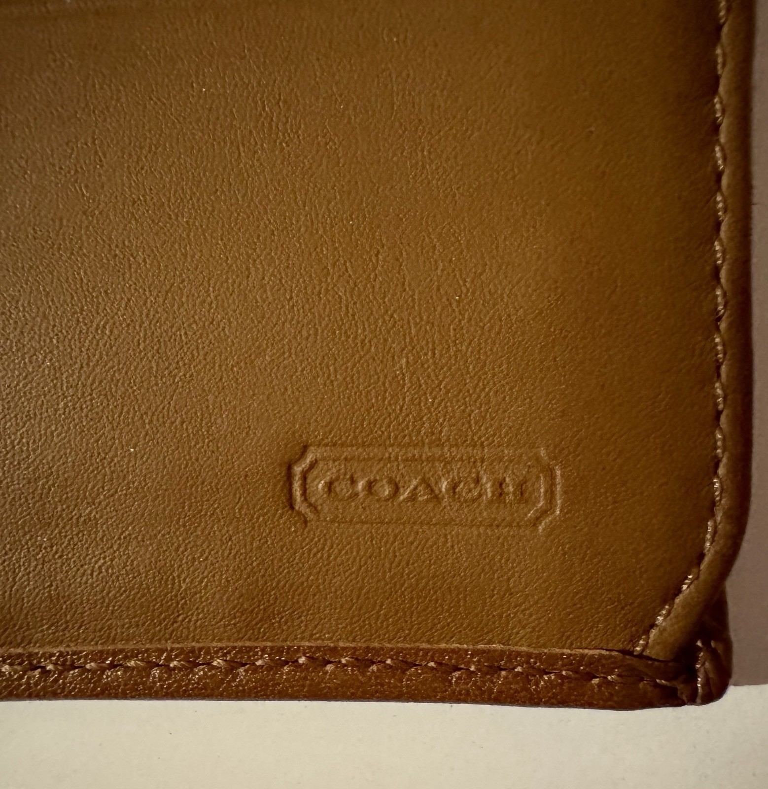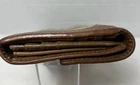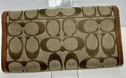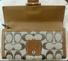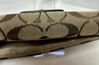 The Coach Signature Soho Buckle Trifold Wallet is a stylish and vintage piece made of leather with a solid beige color. It features a fold-over design with credit card slots, making it both fashionable and functional for women on the go. The wallet is of one size and includes the signature Coach brand, adding a touch of luxury to any outfit. Perfect for adding a touch of sophistication to your daily essentials.