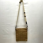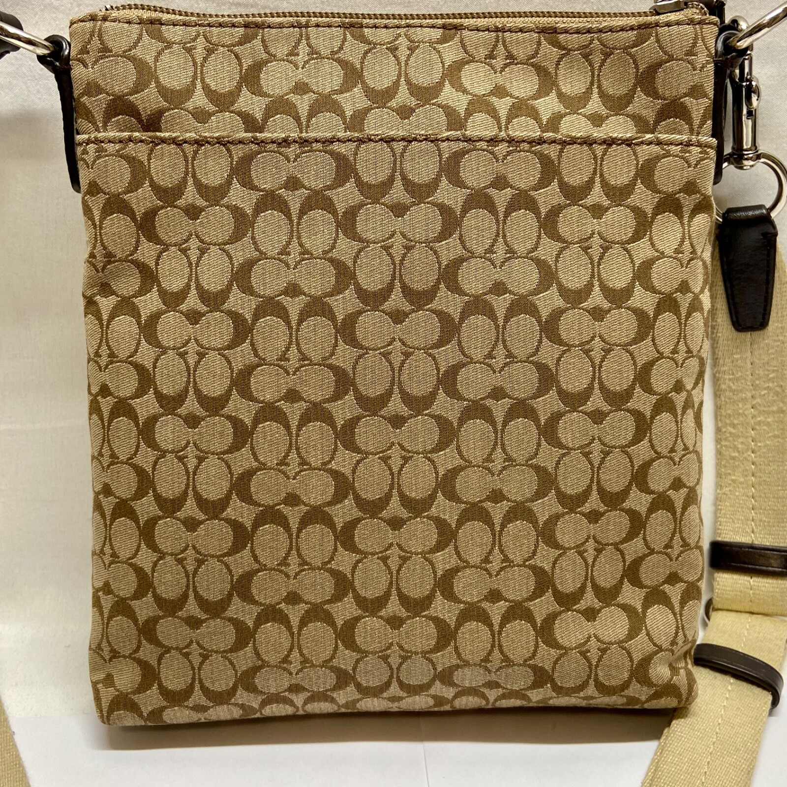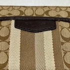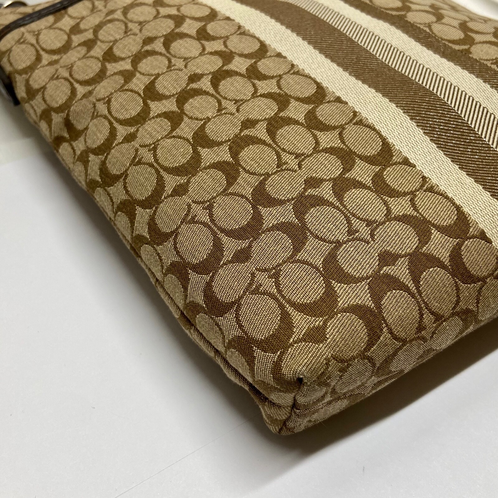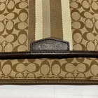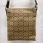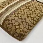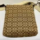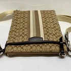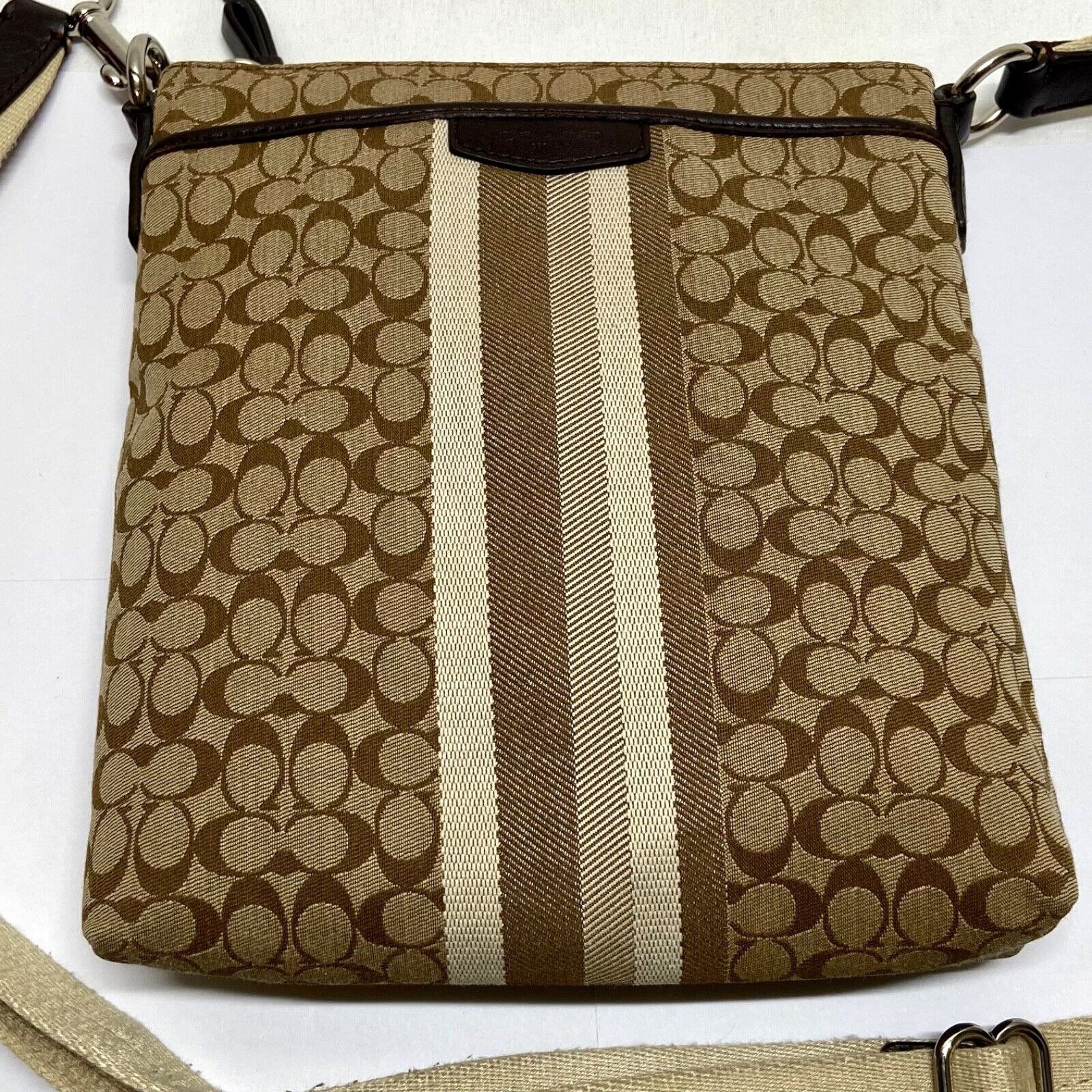 Coach Signature Stripe North/South Swingpack F51648 Cream Khaki Brown Crossbody This bag is in excellent pre-owned condition with minimal signs of use. Please see all photos as this is the exact bag you will receive. Zip top closure, inside sateen liner is clean and features an internal slip pocket. There are 2 additional slip pockets on the outside of the bag. Adjustable crossbody strap. Bag is missing the original bag charm. Measurements are; 8" w, 9" h and 2" deep. Strap is currently set to 18". Thanks for looking!