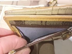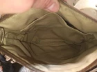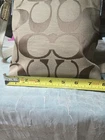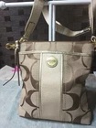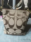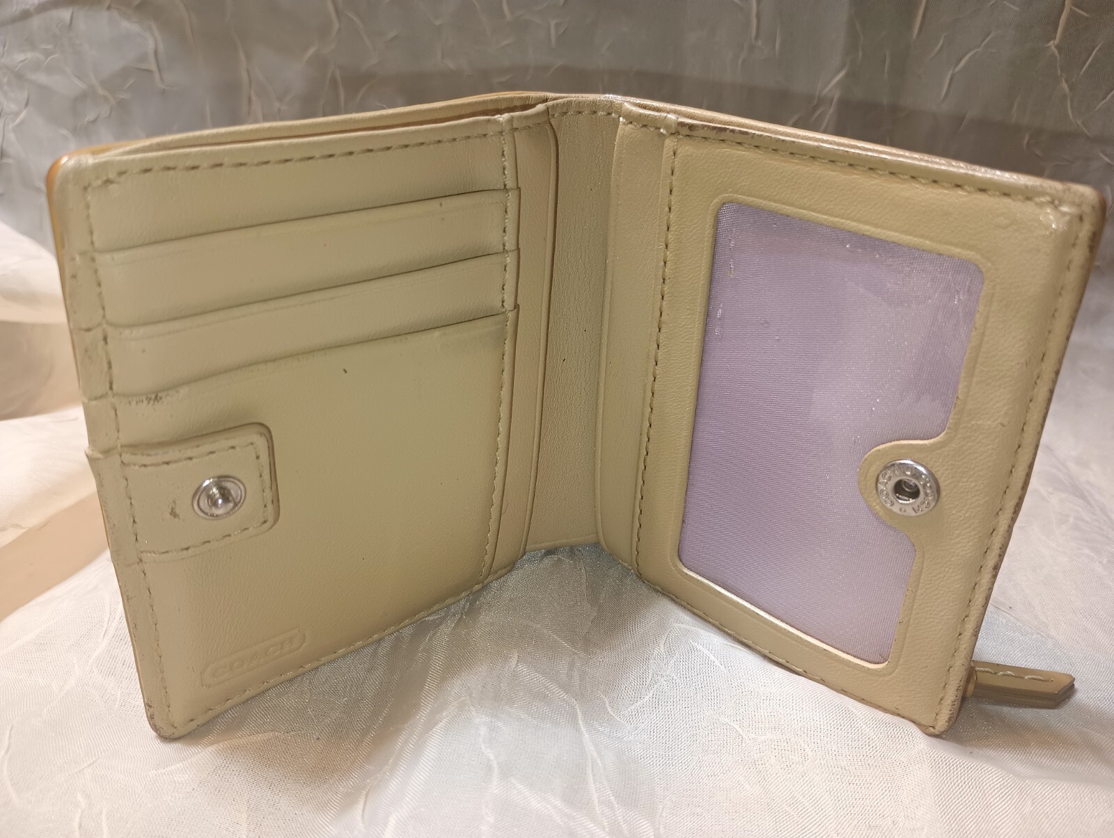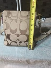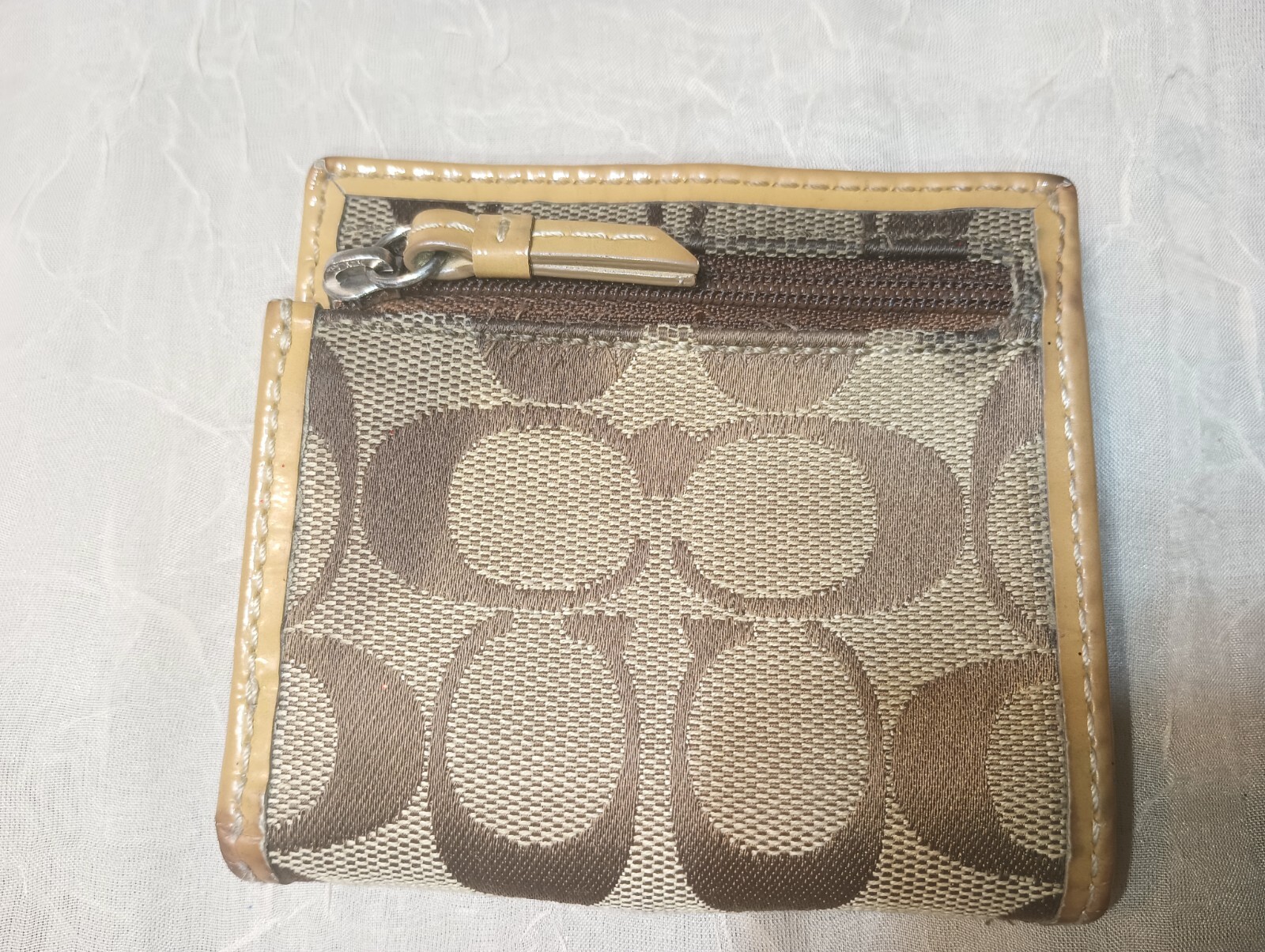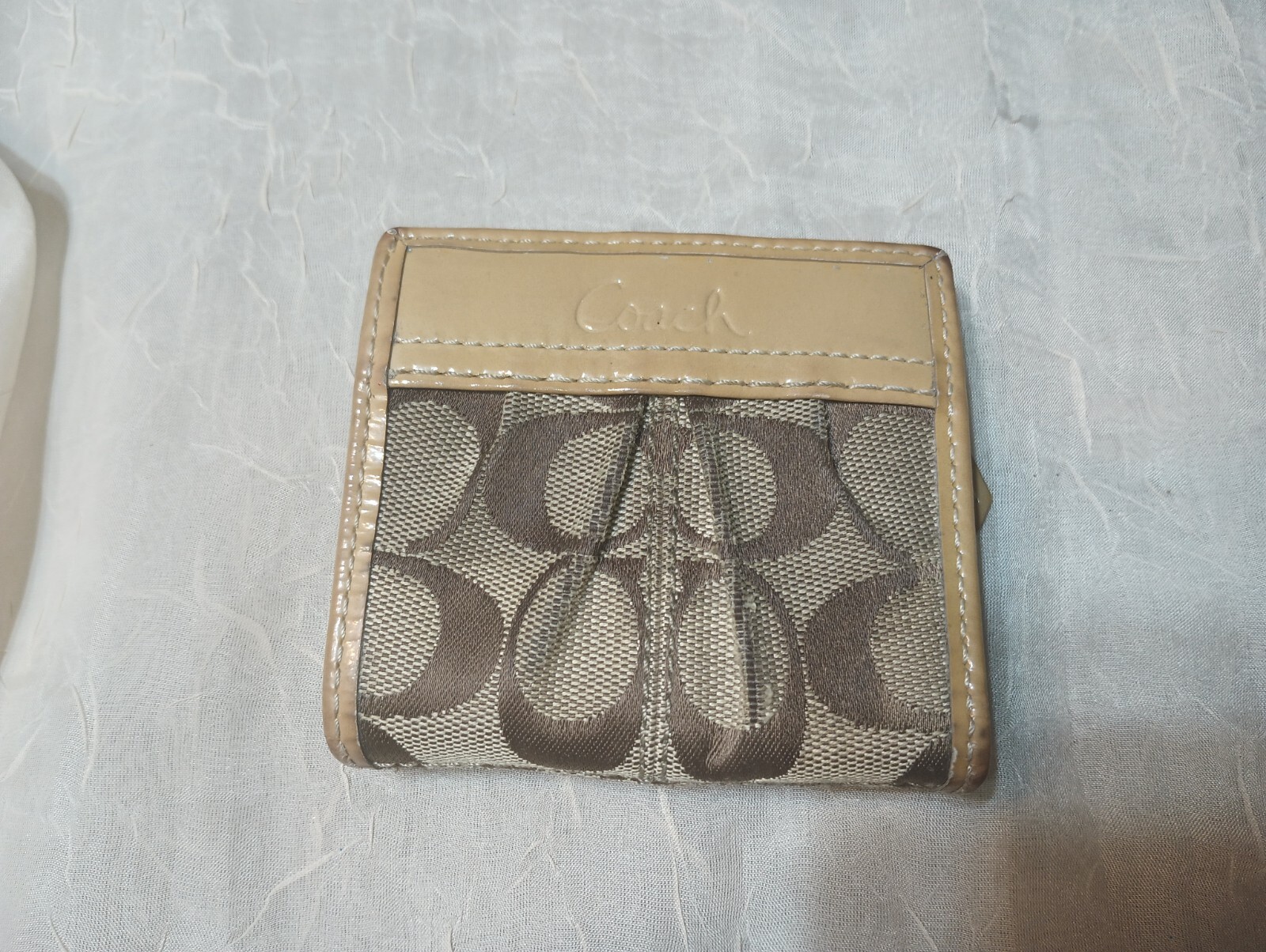 The Coach Signature Tan & Gold Crossbody Bag and Wallet combo are a stylish and small-size. Made from canvas with a fabric liner. It features a zip closure, tan handles/straps, and gold hardware accents. The exterior color is a combination of tan and brown with the iconic Coach logo pattern. This versatile bag has an adjustable strap, making it perfect for everyday use. The set also includes a matching wallet, adding a touch of convenience and sophistication to any outfit. Perfect for women who appreciate quality and timeless design. The wallet is also tan and brown with patient leather accent that has the coach name on the top. It has places for money ,coins and credit cards and a clear plastic covering for you le drivers license. Both are in real good shape .both are being sold together